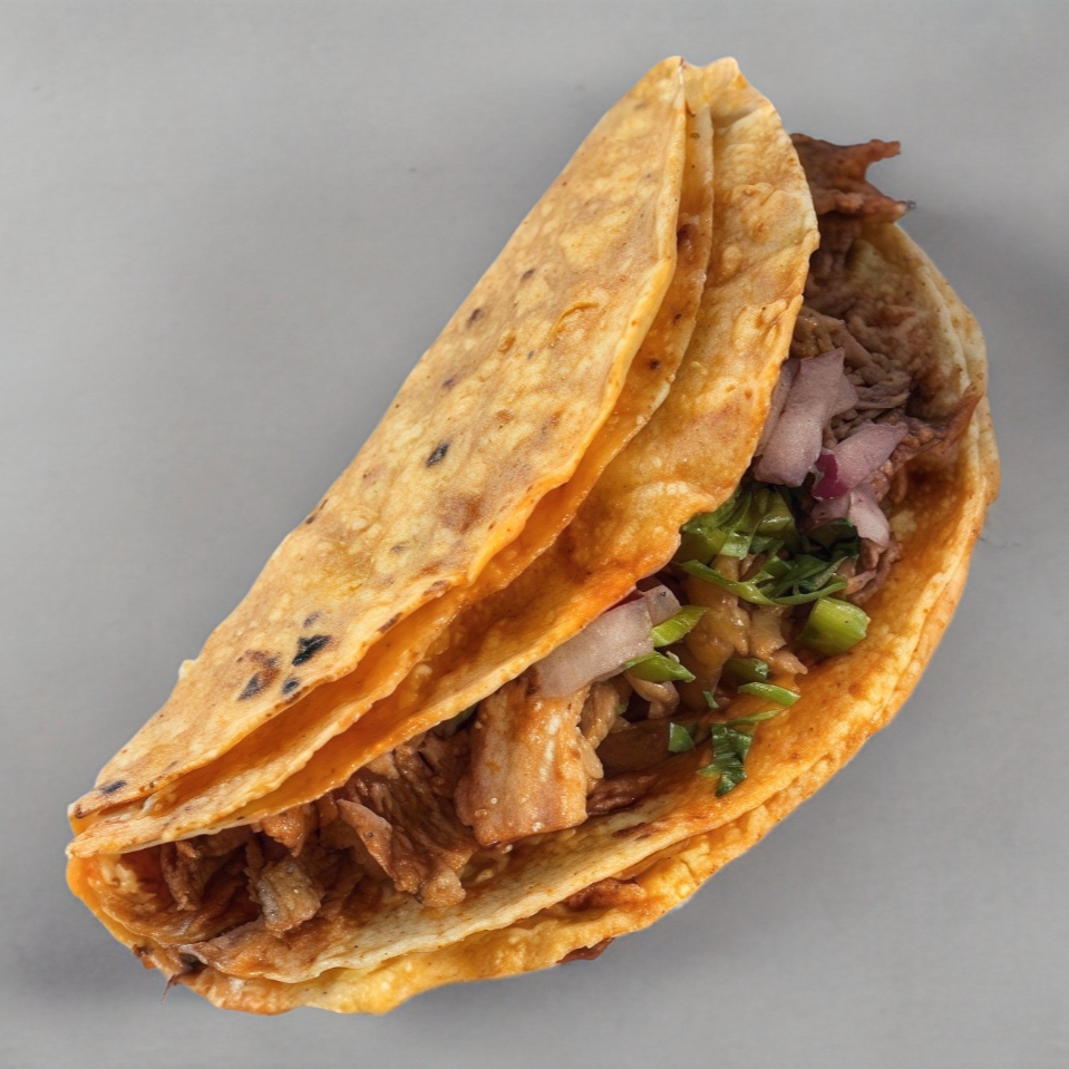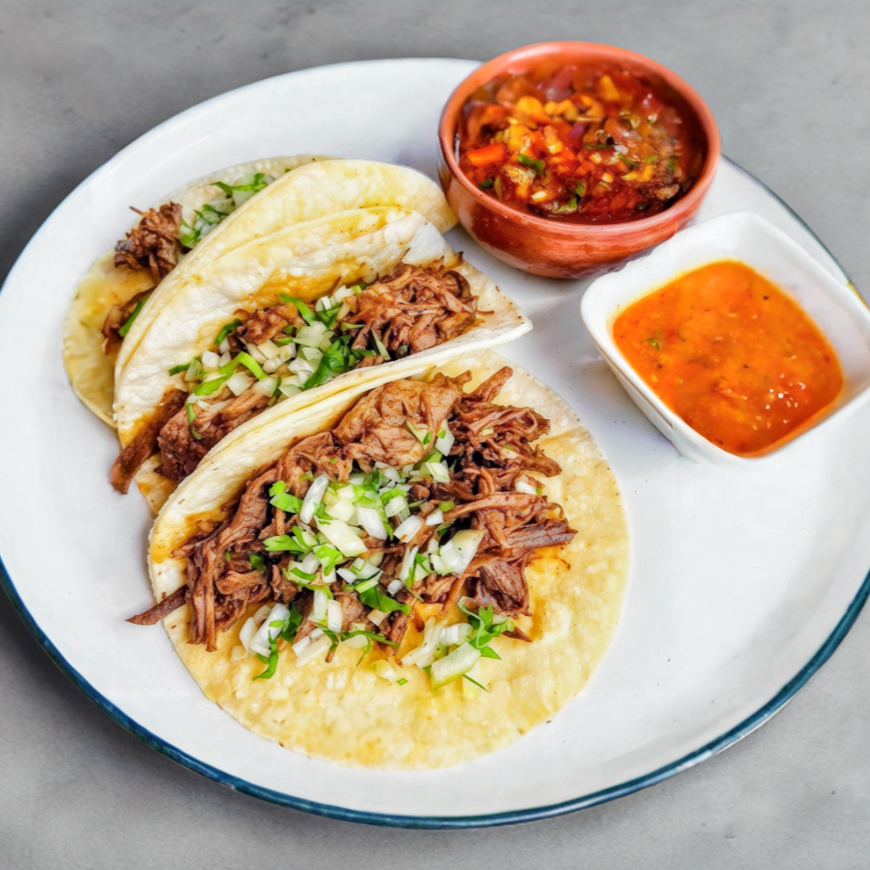 Doble tortilla taquera, 40gr de carne, cebolla, salsa y limón