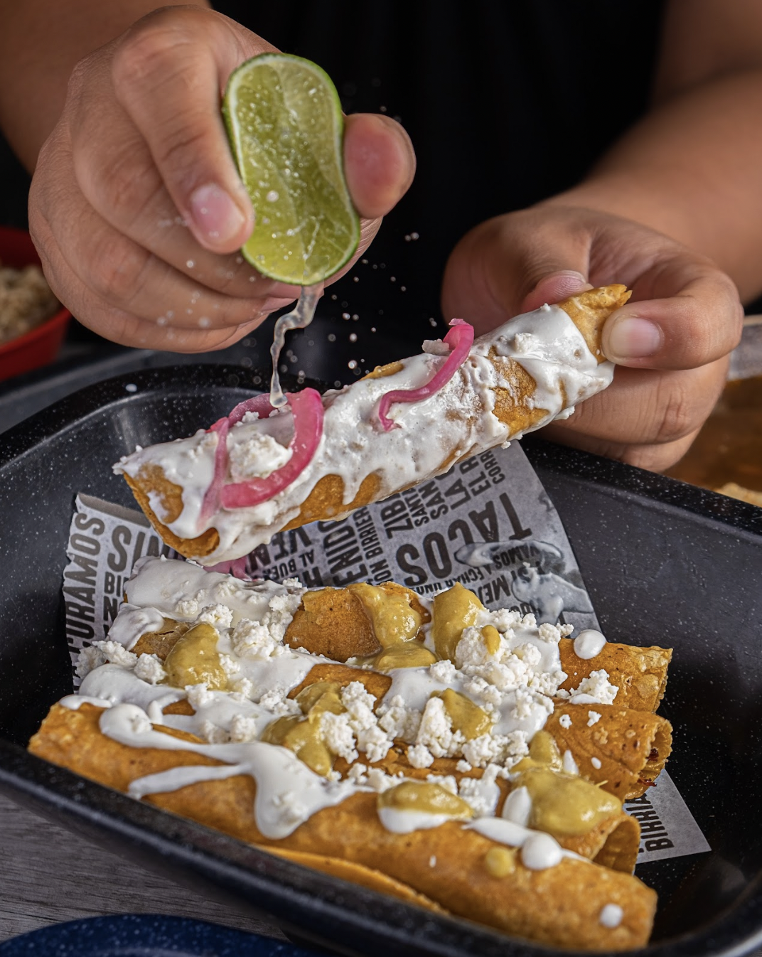 5 PIEZAS DE NUESTRAS TRADICIONALES FLAUTAS RELLENAS DE BIRRIA, ACOMPAÑADAS CON CREMA Y QUESO, ASI COMO TU BEBIDA FAVORITA