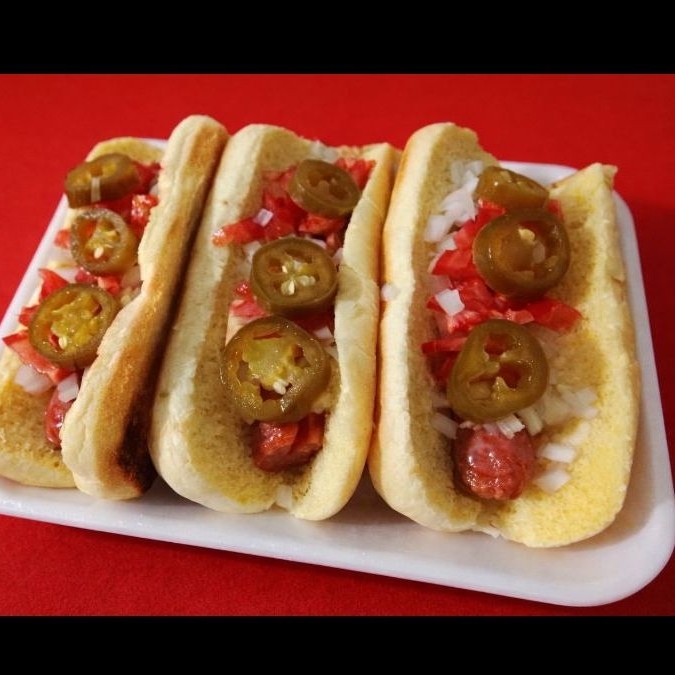 3pz de Hot Dogs con Salchicha, cebolla, jitomate, catsup, mayonesa, mostaza, chiles jalapeños, queso oaxaca, tocino, y trozos de carne de res