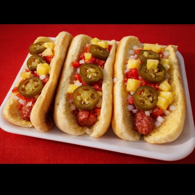 3pz Hot Dogs con Salchicha, cebolla, jitomate, catsup, mayonesa, mostaza, chiles jalapeños, piña, y tocino