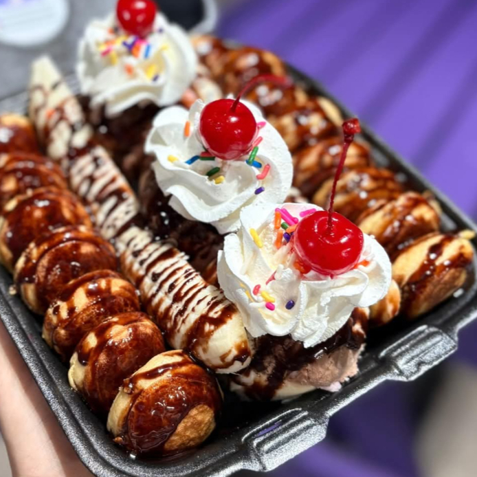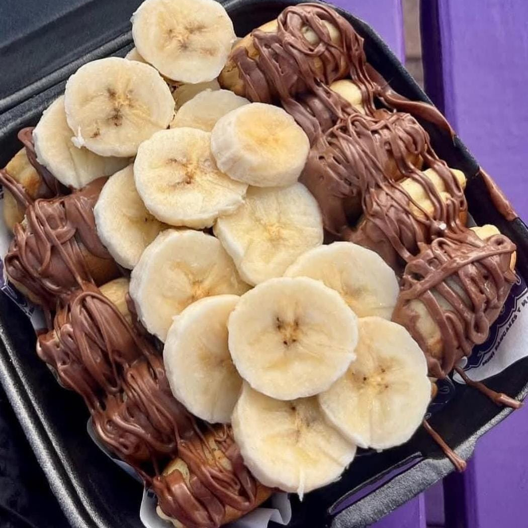 20 minihotcakes,nutella, platano, helado, crema, cereza y chispas de chocolate