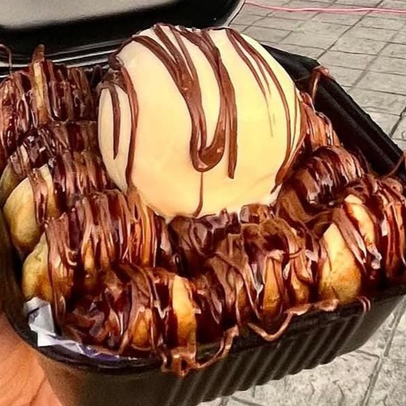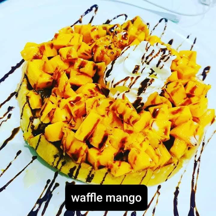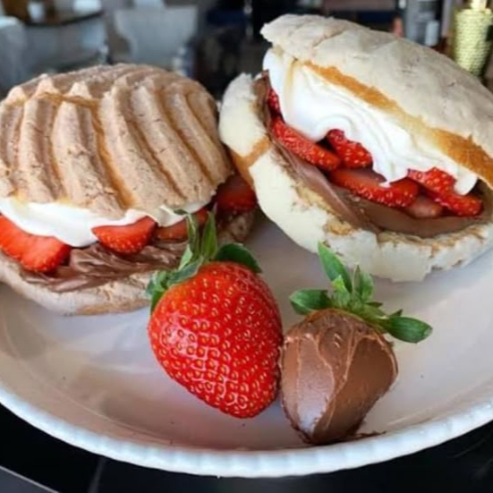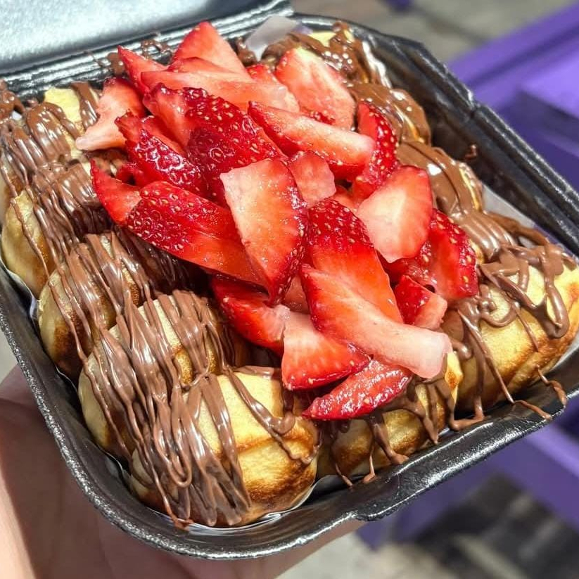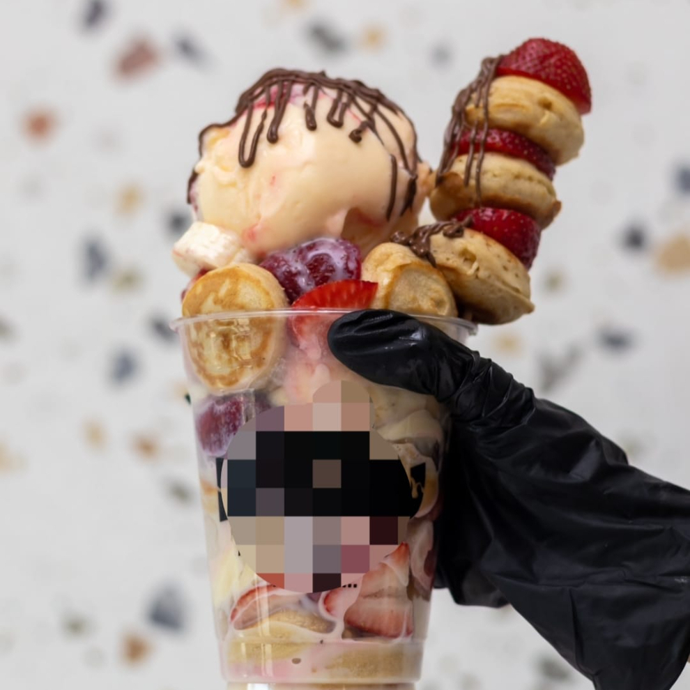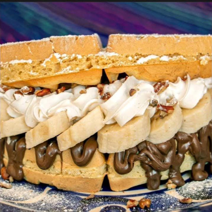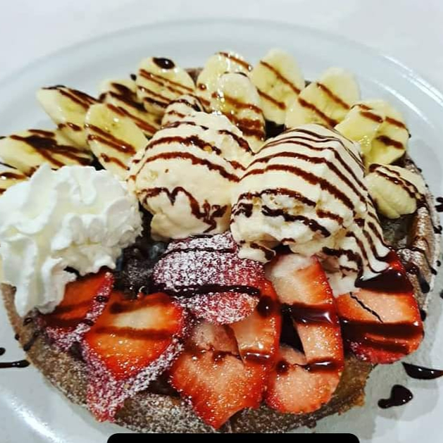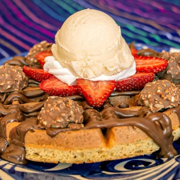 waffle con nutella, fresa, kinder delice, crema batida y helado