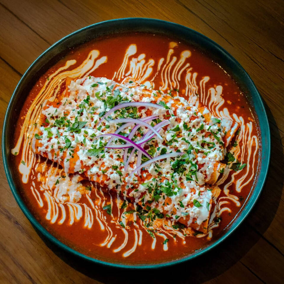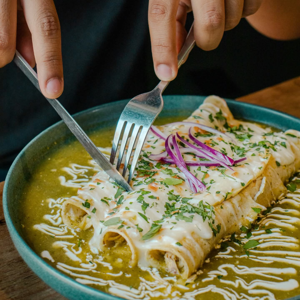 Enchiladas Verdes rellenas de pollo acompañado de cafe y pan