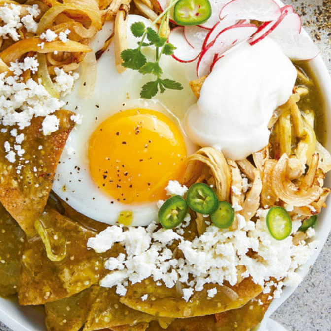 Chilaquiles verdes con huevo, acompañado de cafe y pan