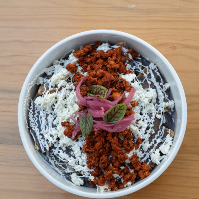 chilaquiles de frijol c/chorizo acompañado de cafe y pan