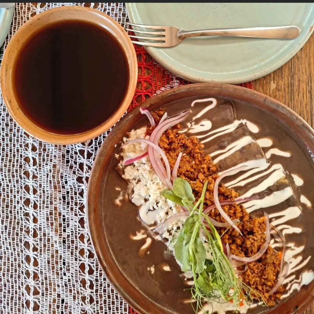 Enfrijoladas rellenas de pollo, bañadas de frijol negro, acompañadas de cafe y pan dulce