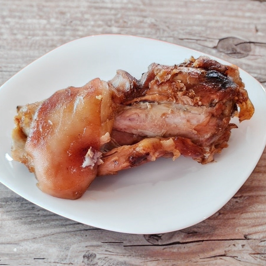 Pieza de chamorro hecha en carnitas. Incluye salsa, chiles y tortillas.