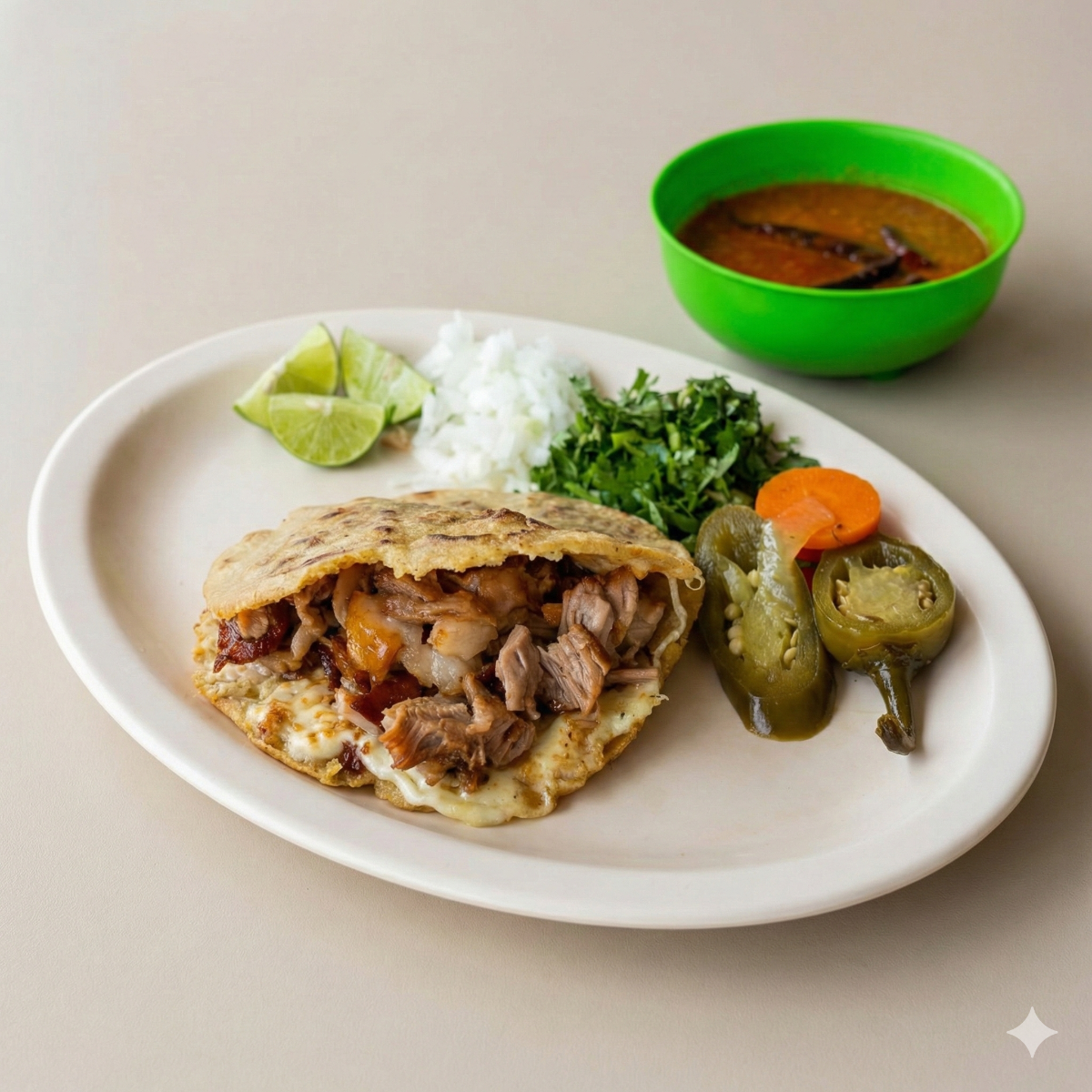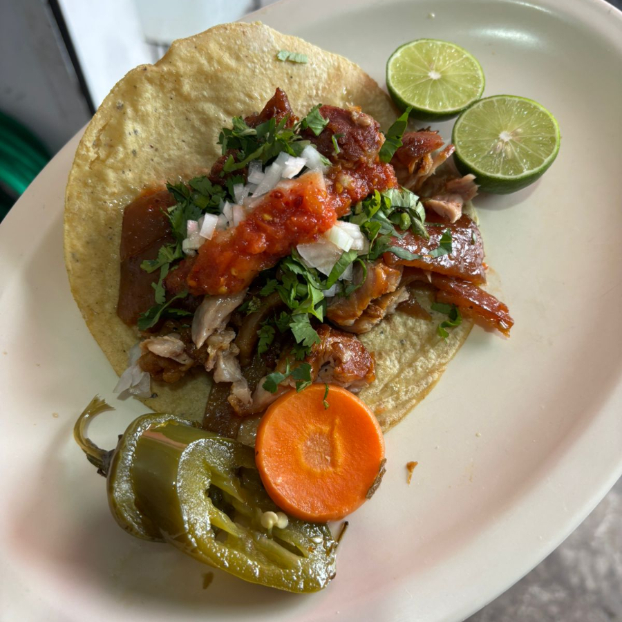 Incluye 1 /2 kg de carnitas, salsa roja, chiles en vinagre, cebolla, cilantro y limones, 1 docena de tortillas hechas a mano y 1 refresco de 2 litros.