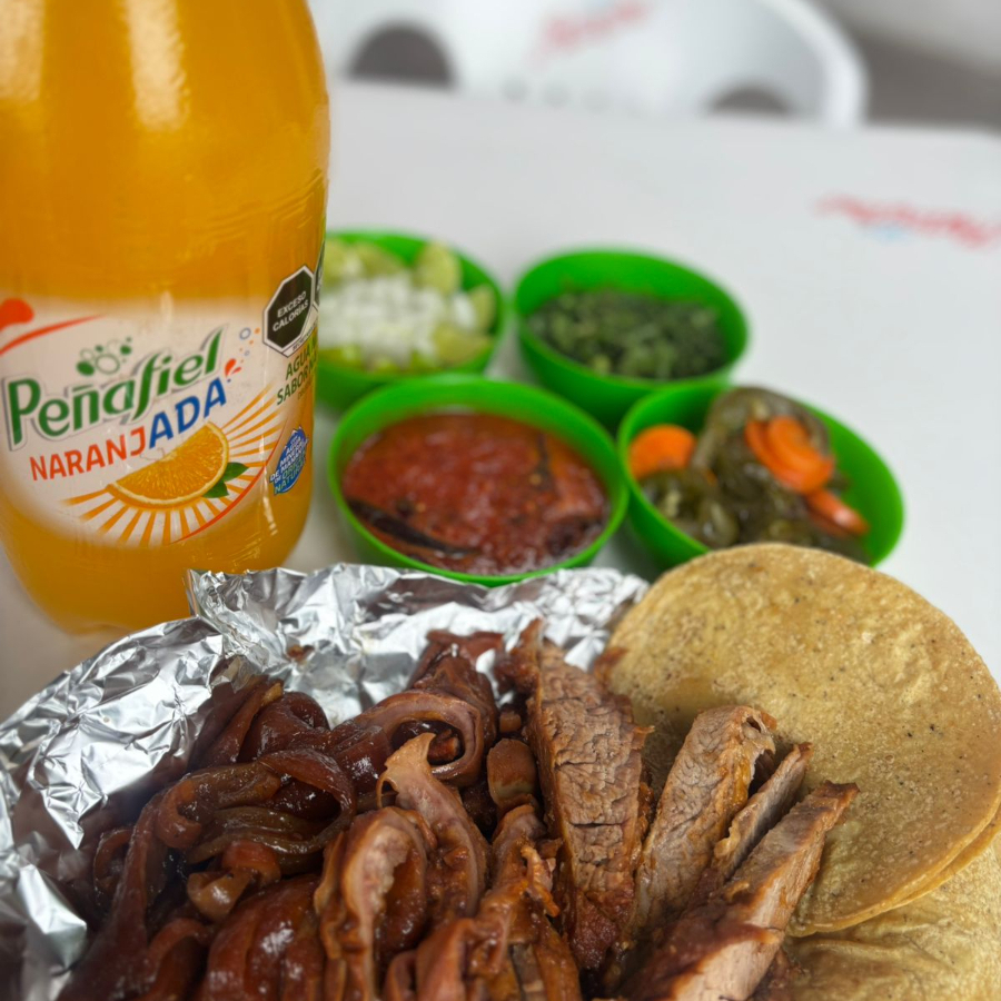 Incluye 3 tacos surtidos, salsa roja, cilantro, cebolla y limones 1 refresco de lata.