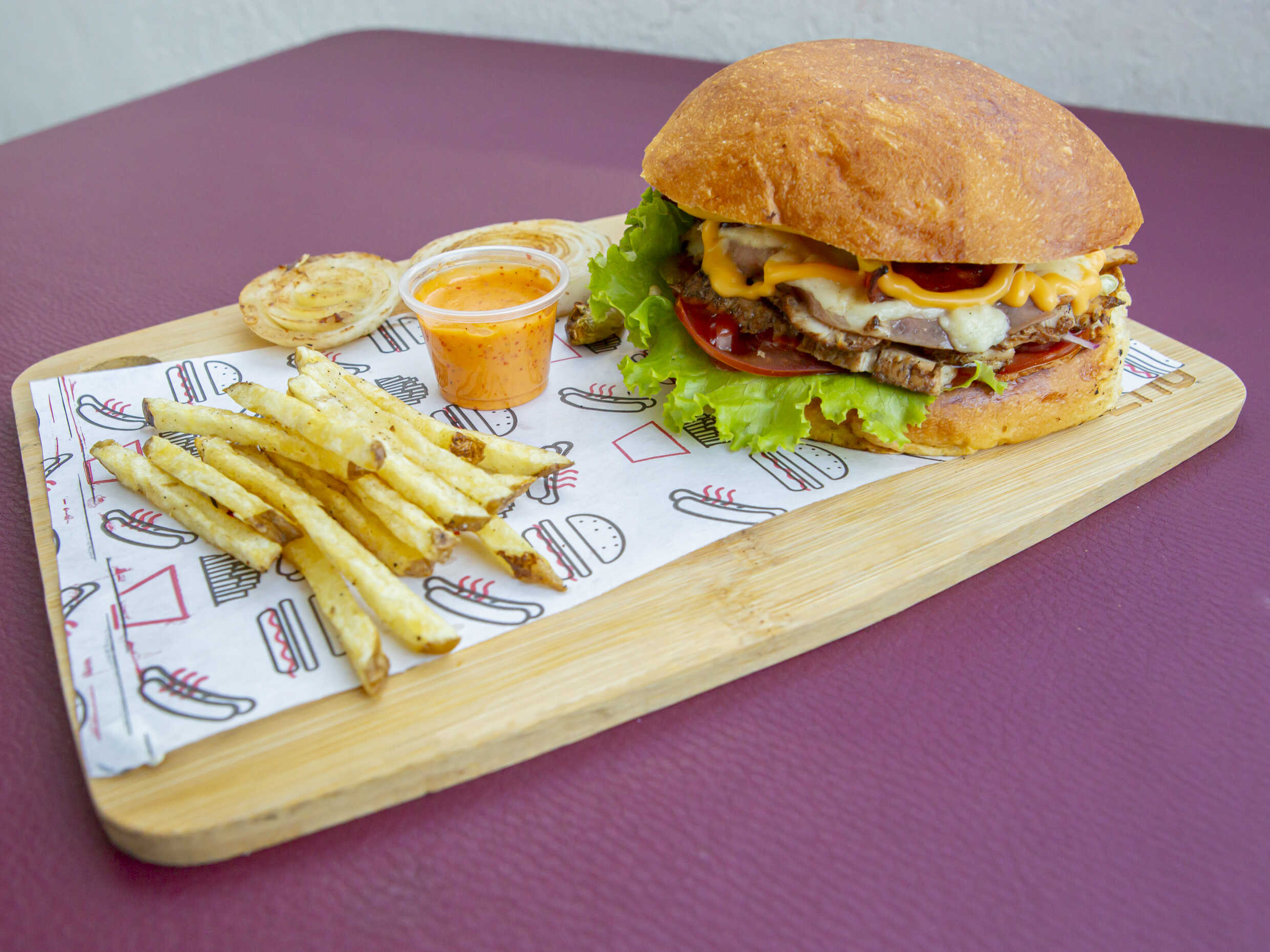 Incluye jamón, tocino, queso oaxaca, queso amarillo y una pequeña porción de papas.