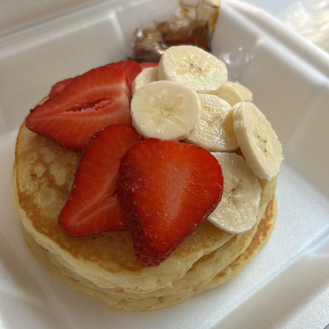 Tres piezas de Hotcakes con plátano y fresa, con nutella, miel maple y mermelada de fresa