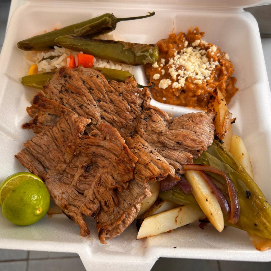 Pechuga o res asada, acompañada de frijoles, arroz, nopales cebolla, papa y chile asados, agua de sabor natural de 500ml