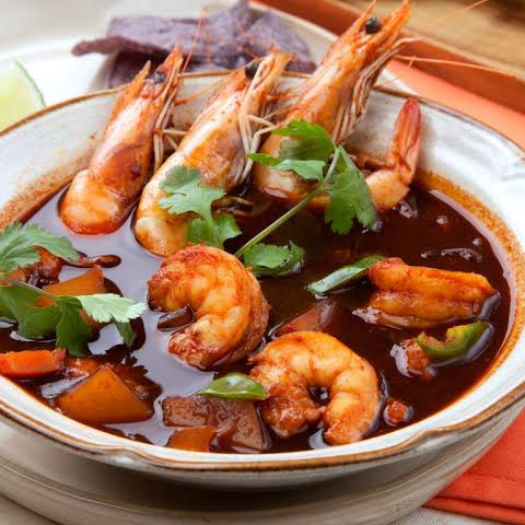 Camarón con papá, chayote, zanahoria incluye aguacate, cilantro, cebolla morada, chile serrano, pan y galletas saladas