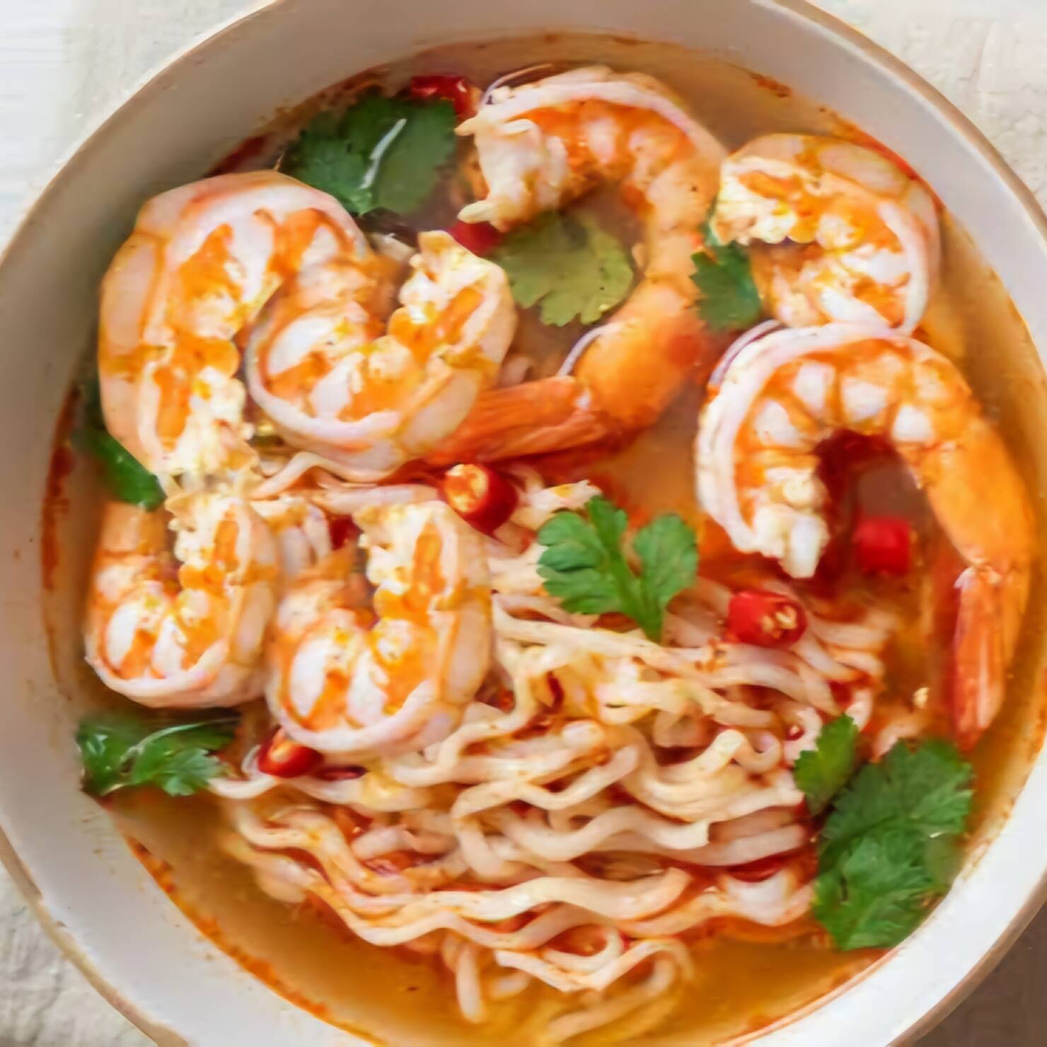Maruchan preparada con caldo de camarón acompañada de galletas, salsa valentina y salsa habanero.
