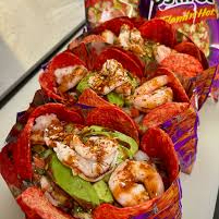 Camarón, pepino, jitomate, cilantro, chile serrano y aguacate incluye tostadas, salsa valentina y habanera.