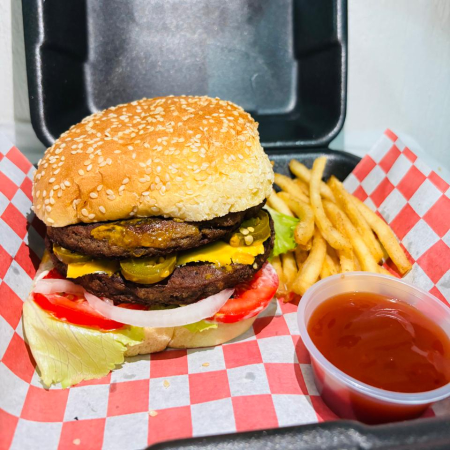 Doble carne, doble queso amarillo, jitomate, cebolla, lechuga, mostaza, mayonesa, capsut, porcion de papas, doble jugosidad y mucho más sabor para los que tienen hambre de verdad.