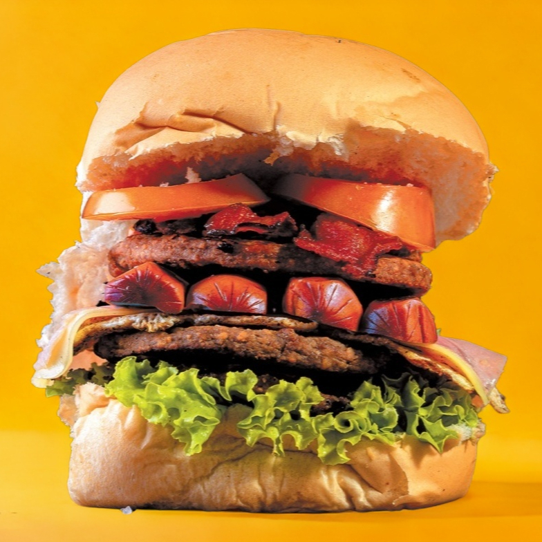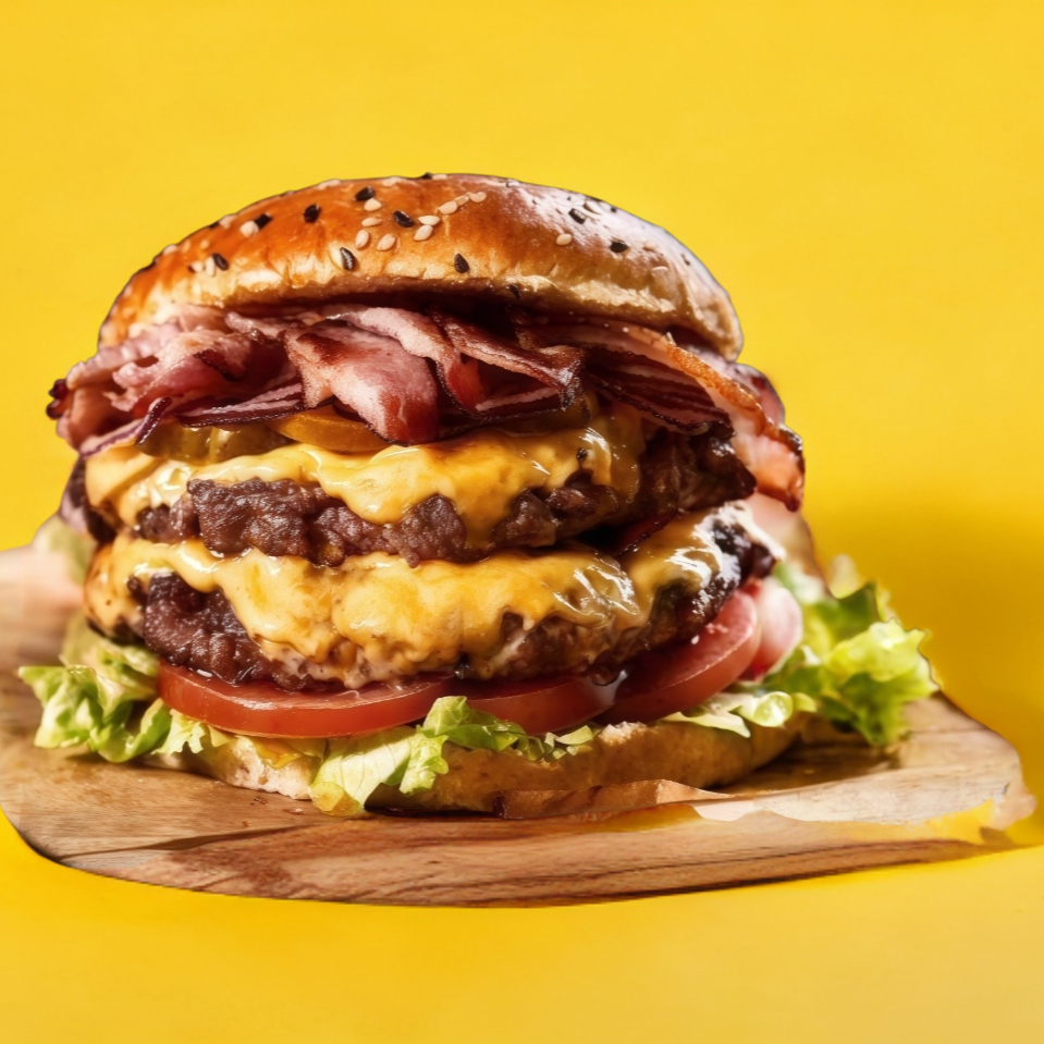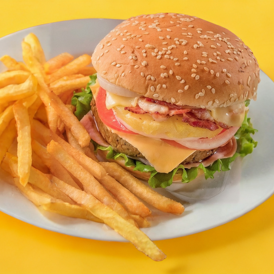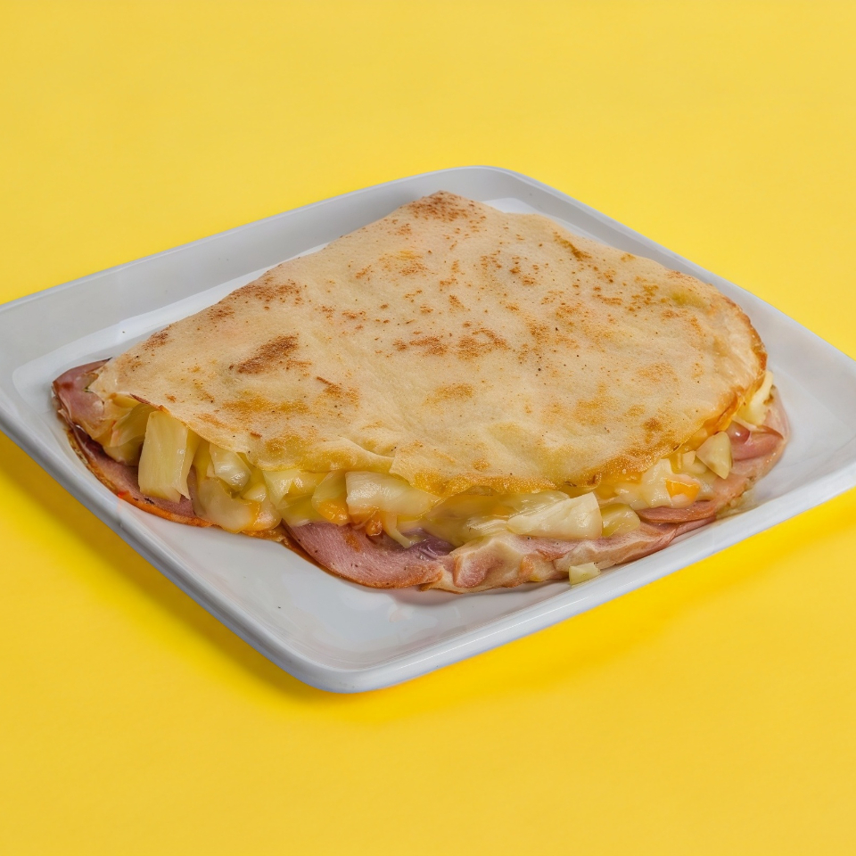 Doble carne de la casa , cebollita asada ,queso amarillo ,tocino jamon , salchicha , queso oaxaca,BBQ,vegetales y aderezos