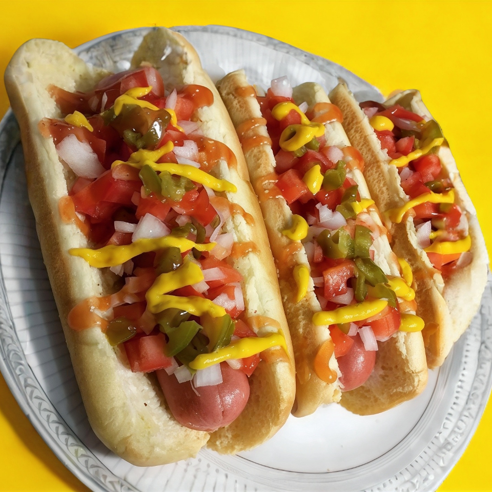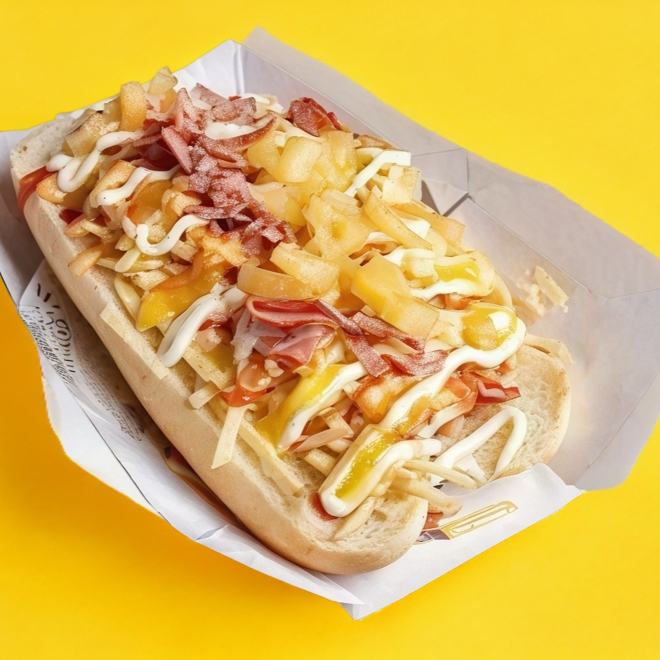 pan , salchicha doradita, queso , carne de lacasa , aderezos verdurita
