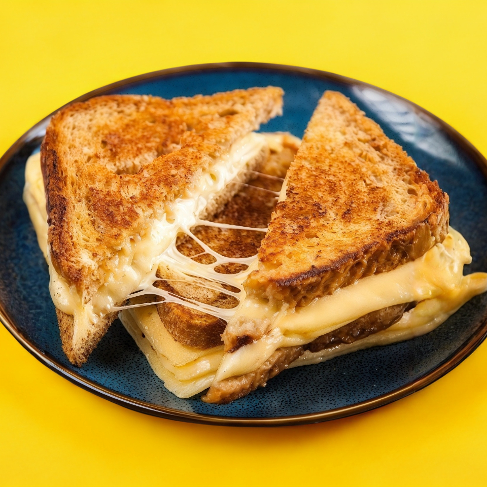 tres piezas de pan, tres tipos de queso, aderezos y verdura