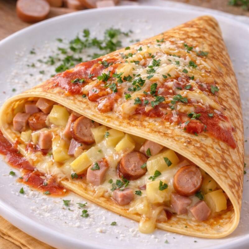 Crepa a base de harina de trigo Salsa de tomate,jamon de pavo Salchicha,piña,queso manchego y queso gouda