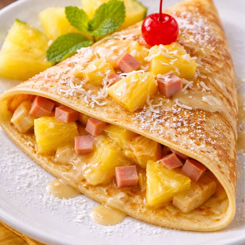 Crepa a base de harina de trigo, Pasta ragú,queso pizzero,jamon de pavo,porcion de piña Coronada con queso parmesano