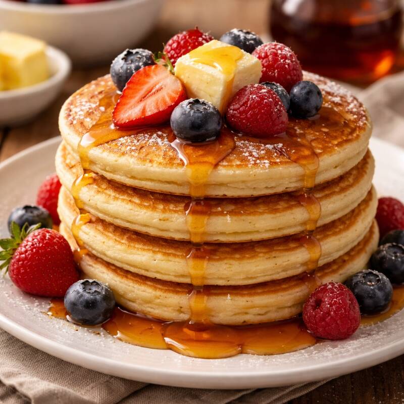 Orden de 4 piezas de Hotcakes,elige entre lechera,miel o mermela,agrega frutos si asi lo deseas