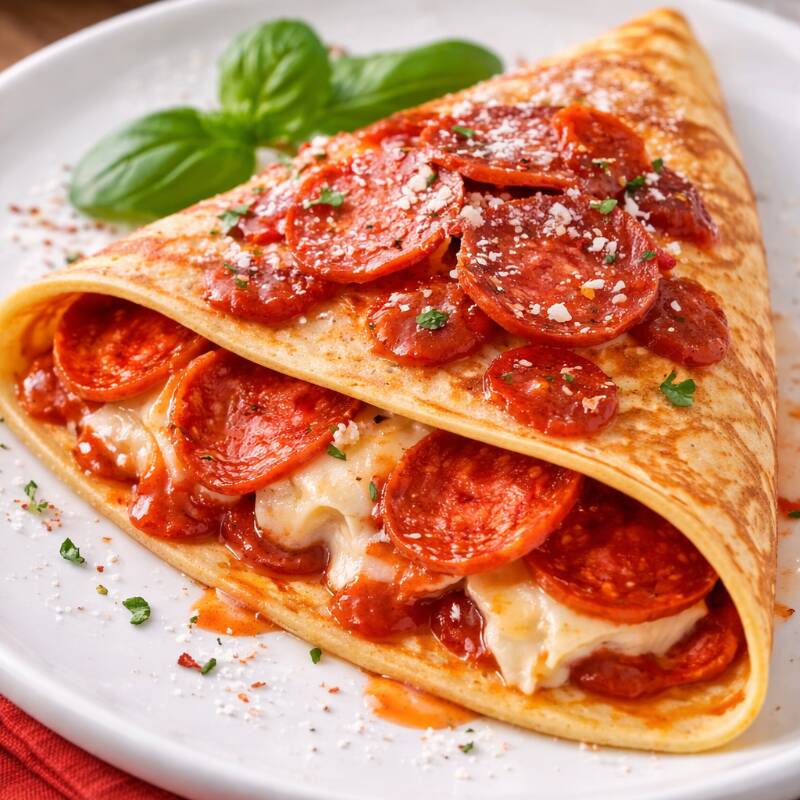 Crepa a base de harina de trigo, Pasta Ragú,queso pizzero,peperoni Coronada con queso parmesano