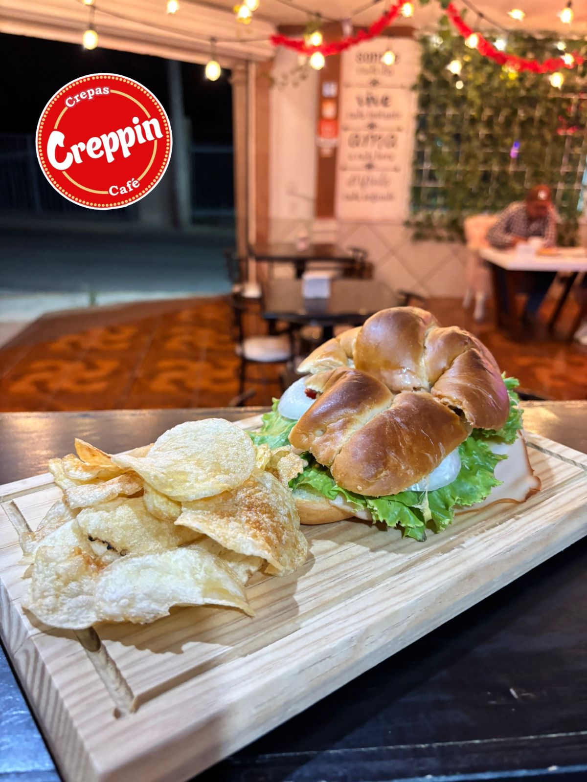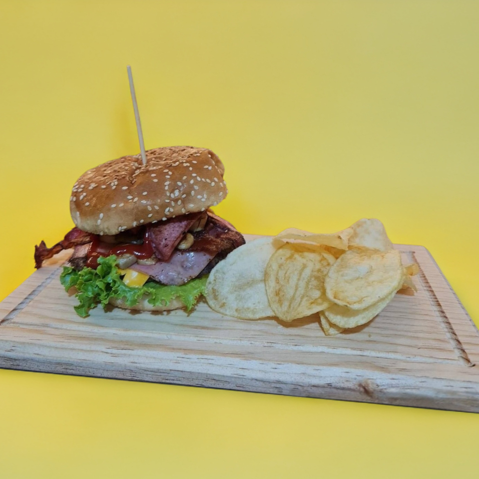 Con papas hojuelas, pan grande, carne de res, queso amarillo, lechuga, jitomate, cebolla, mayonesa, mostaza y catsup.