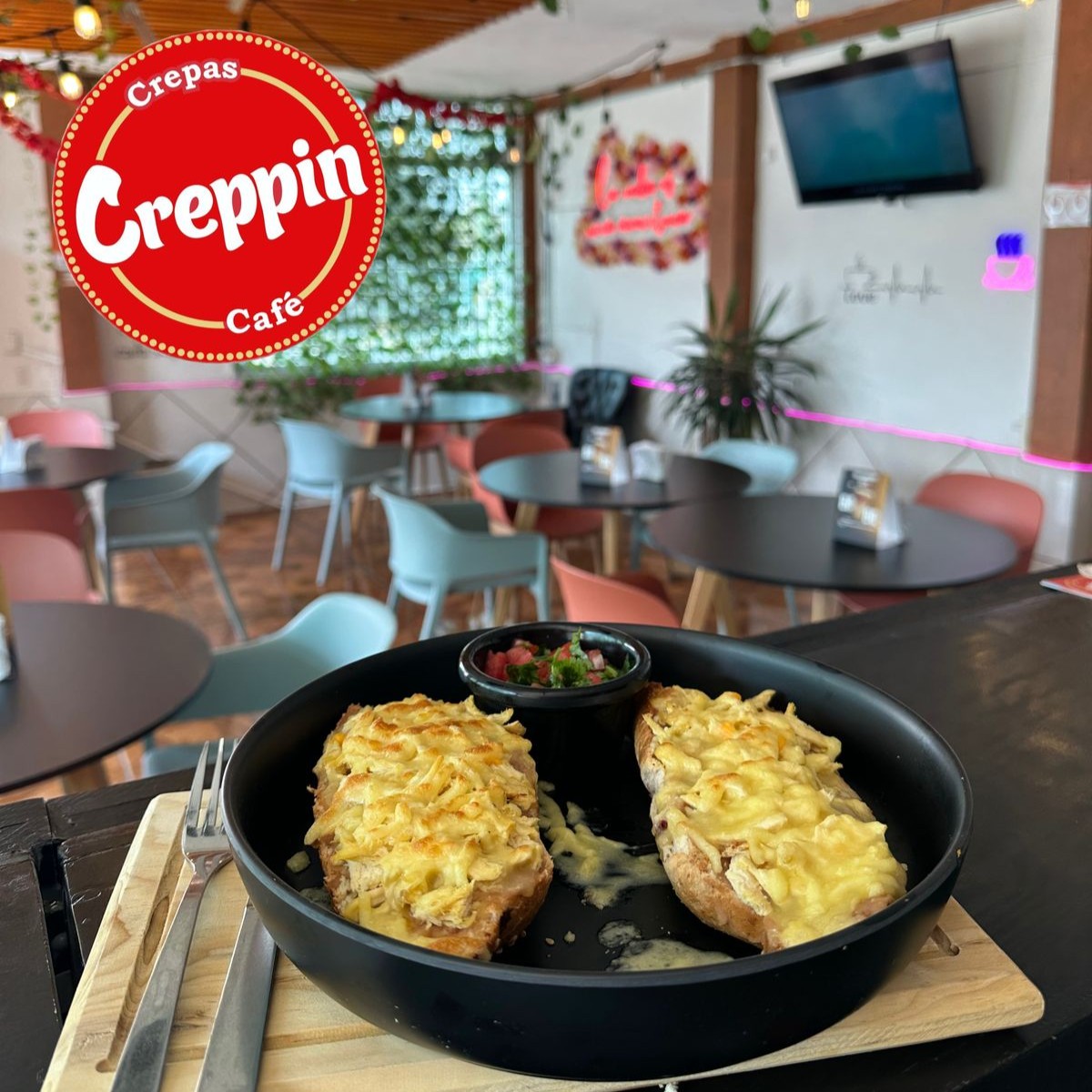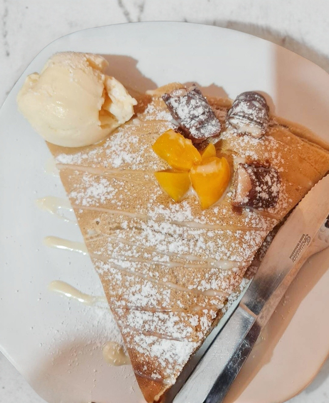 Crepa a base de harina de trigo, con lechera, mango, durazno, y shot de baileys, relleno de philadelphia.