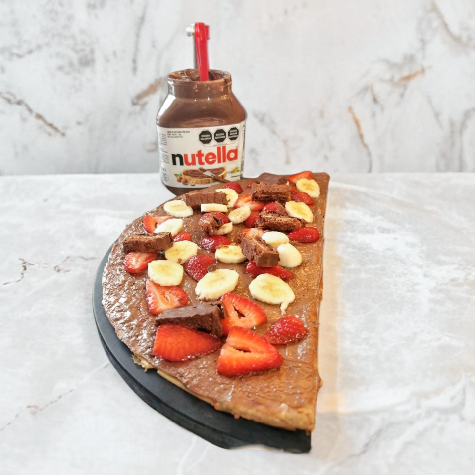 Crepa a base de harina de trigo con fresa, plátano, kinder bueno, rellena de nutella y philadelphia.