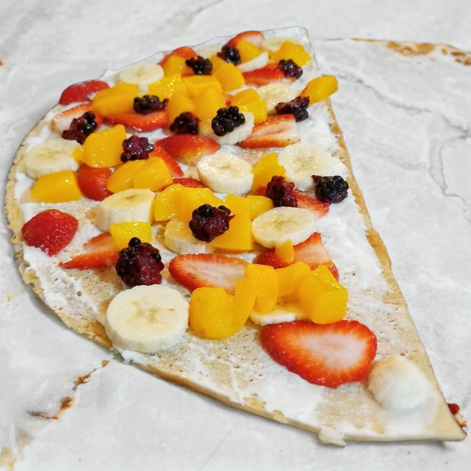 Crepa a base de harina de trigo, con fresa, plátano, durazno, zarzamora y tu base a elegir.
