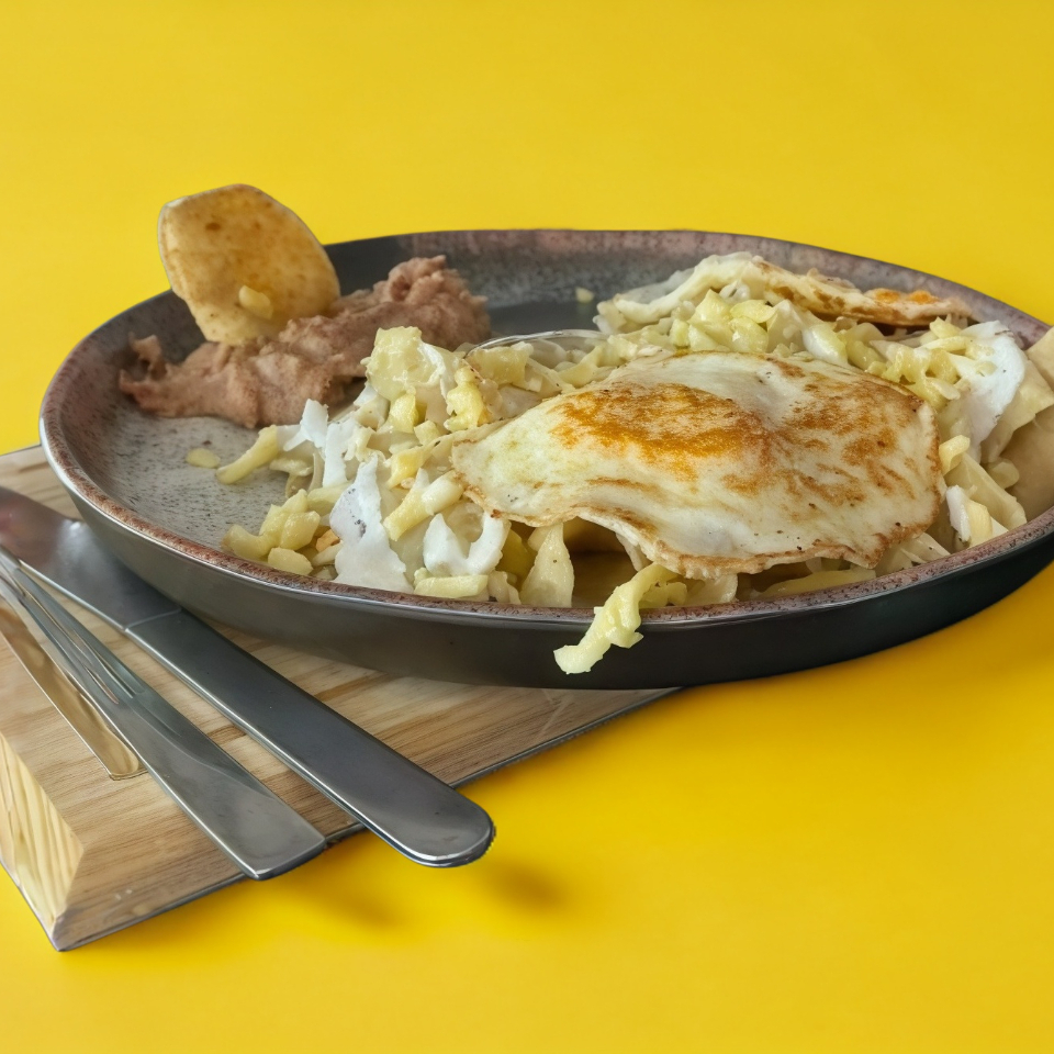 Escoge tus huevos entre nuestras especialidades Revuletos con Jamón, Revuletos con Tocino ó a la mexicana, Acompañados de frijoles refritos.