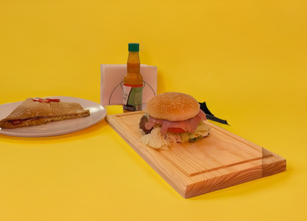 Con papas hojuelas, pan grande, carne de res doble, queso amarillo, queso oaxaca, jamón, tocino, lechuga, jitomate, cebolla, mostaza y catsup.