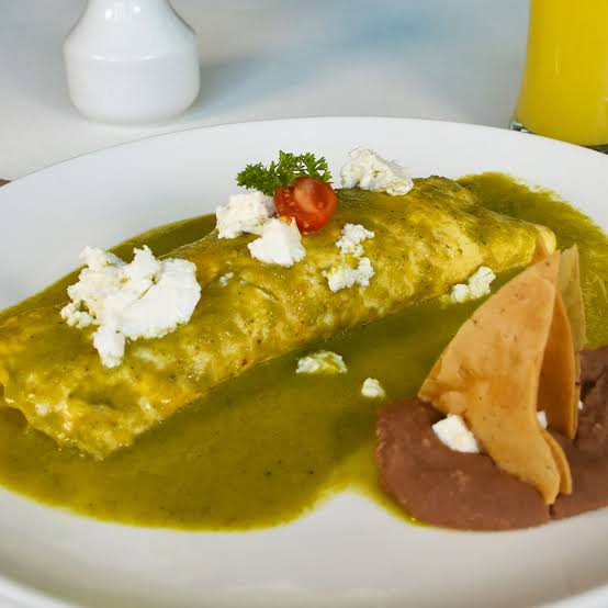 delicioso burrito de huevo con una base de frijoles, arroz, guacamole y queso oaxaca