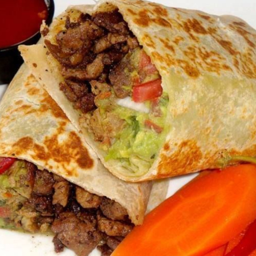 delicioso burrito de carne asada con una base de guacamole y queso oaxaca