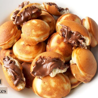 charola grande de mini hot cakes con fruta, lechera y mermelada