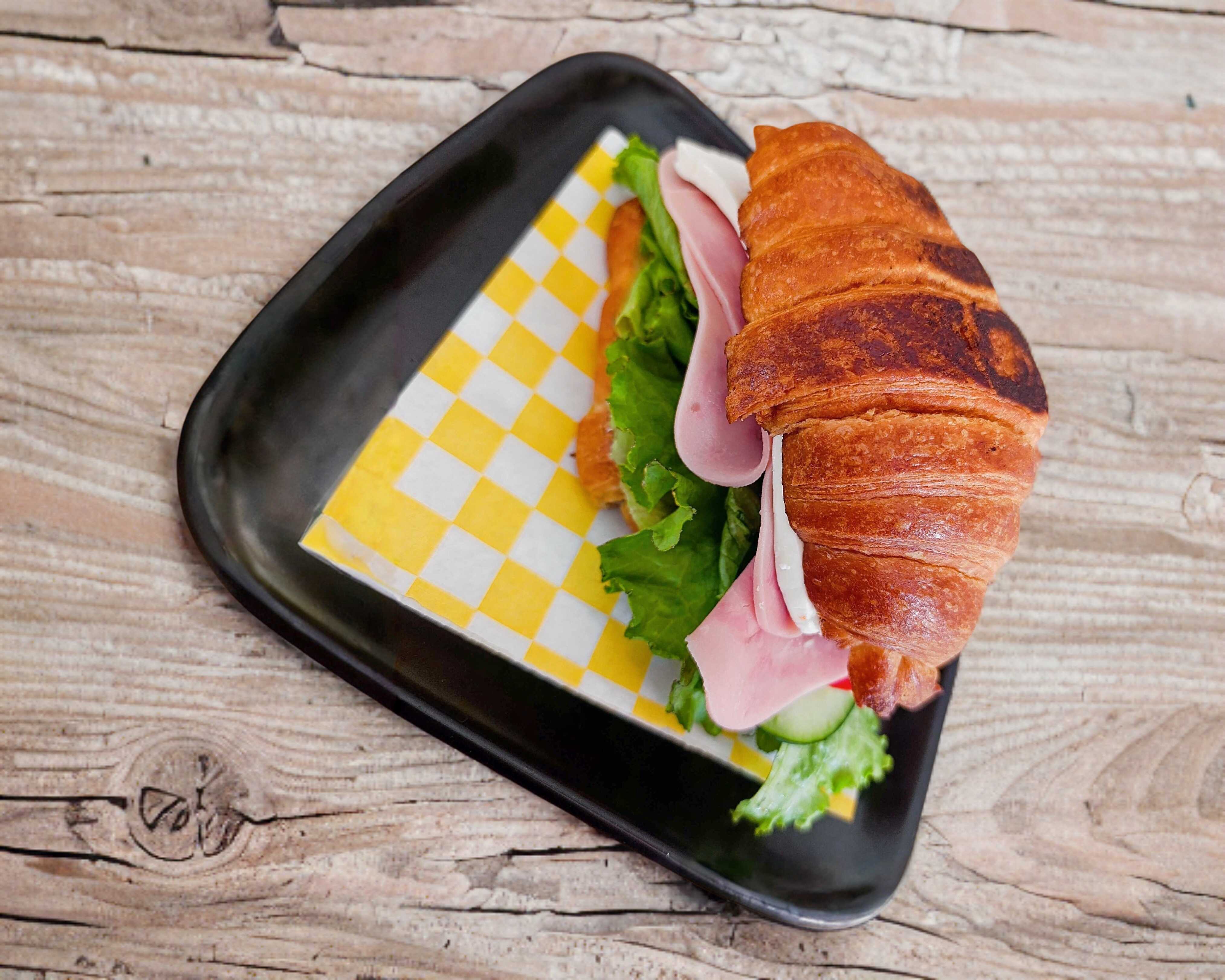 Croissant tostado, relleno de jamón de pavo, queso panela, lechuga, jitomate, cebolla y aguacate.