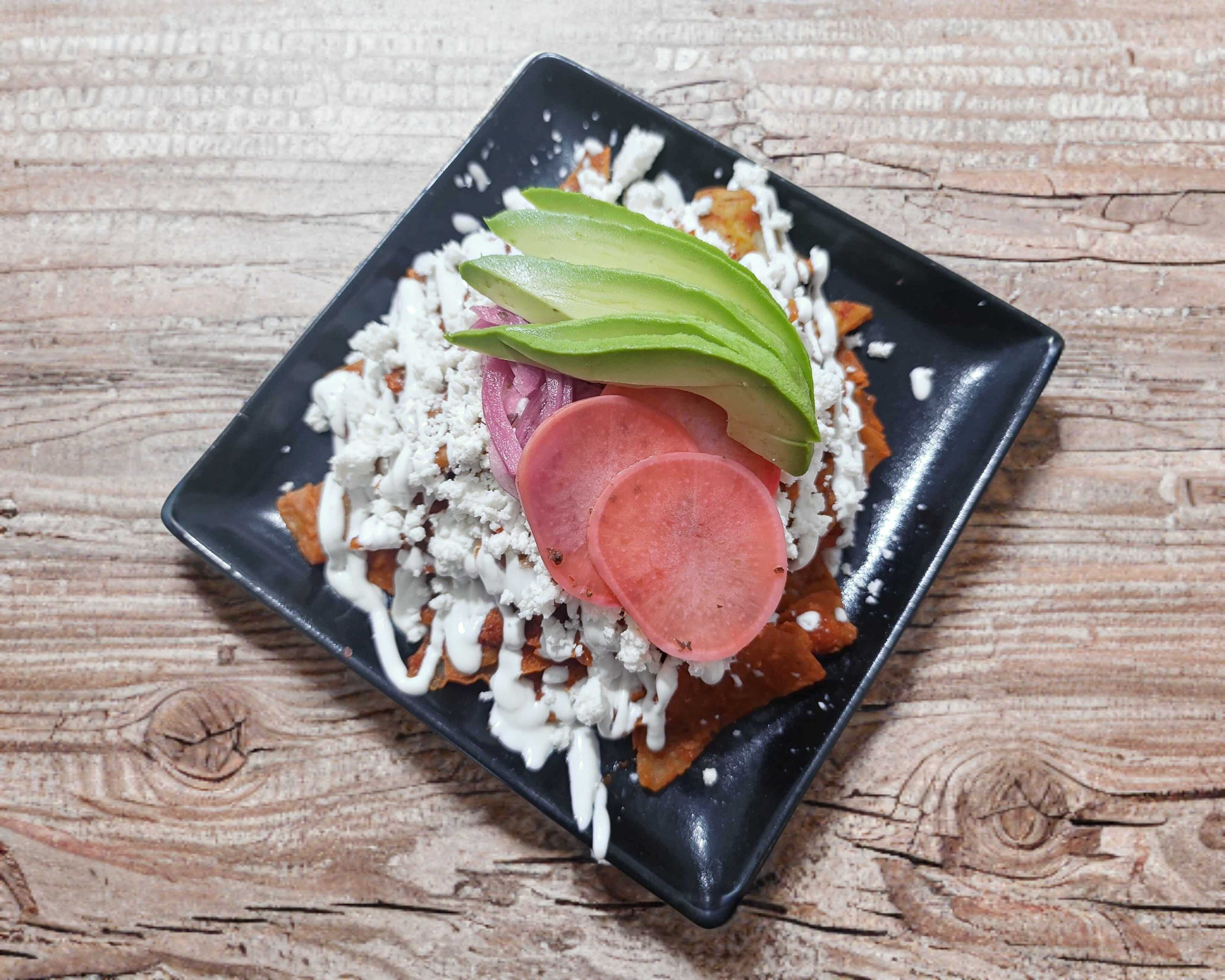 Deliciosos totopos caseros bañados en salsa roja a base de chile de arbol y guajillo, acompañado de crema, queso, cebollitas encurtidas y aguacate.