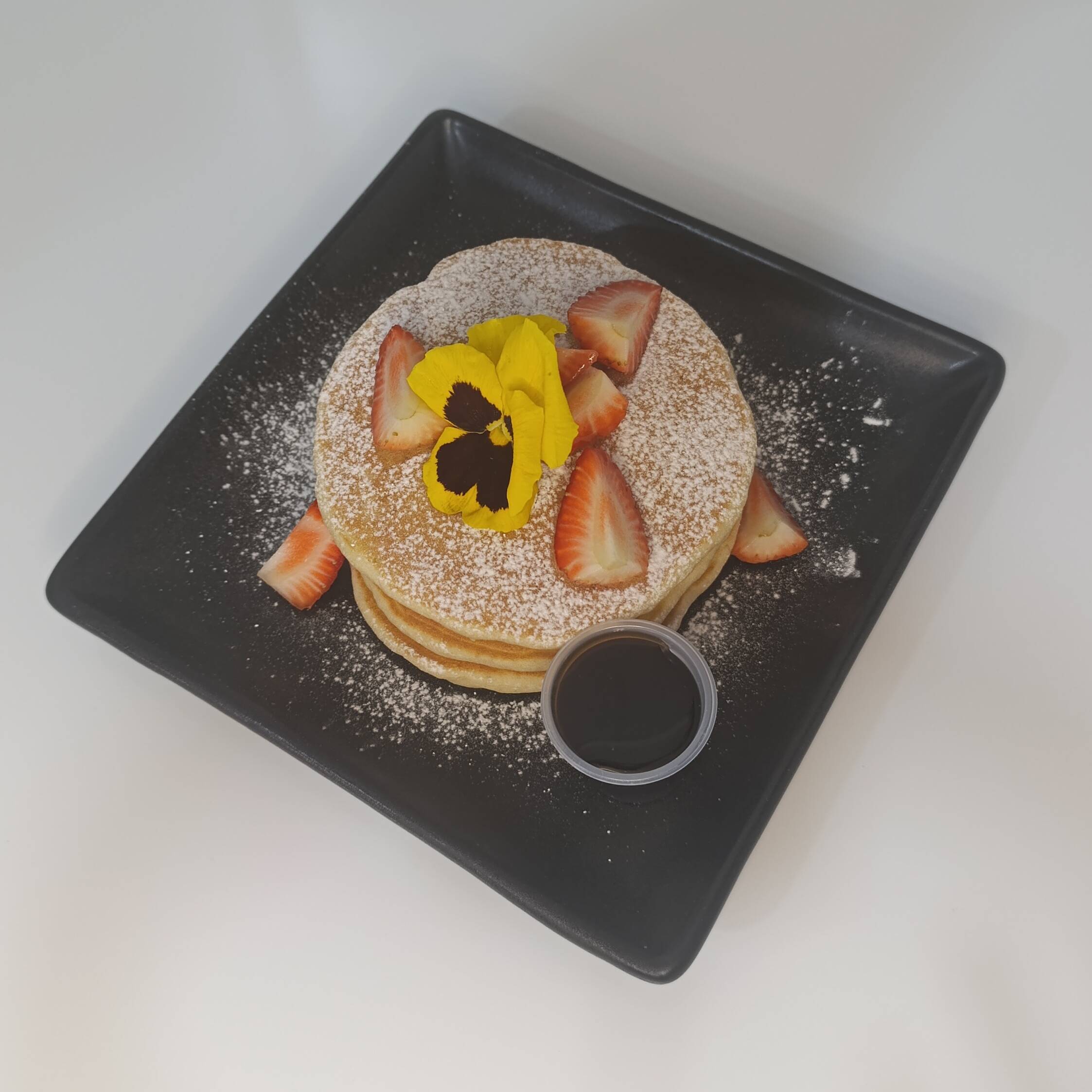 3 piezas de hotcakes grandes, acompañados de mermelada o miel maple y fruta de temporada.