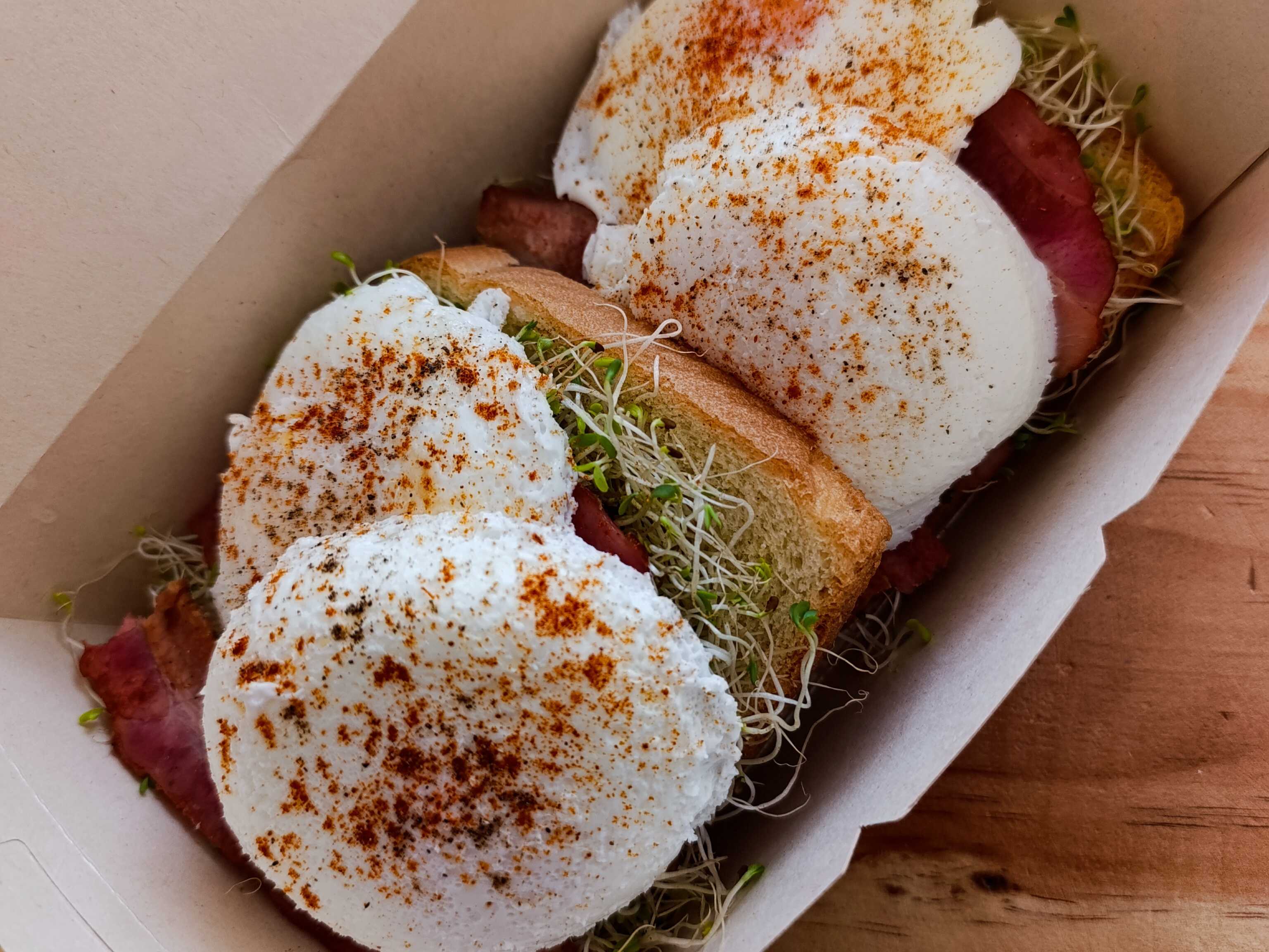 Pan de caja artesanal, 2 huevos estrellados, tocino, queso panela, espinaca y aguacate