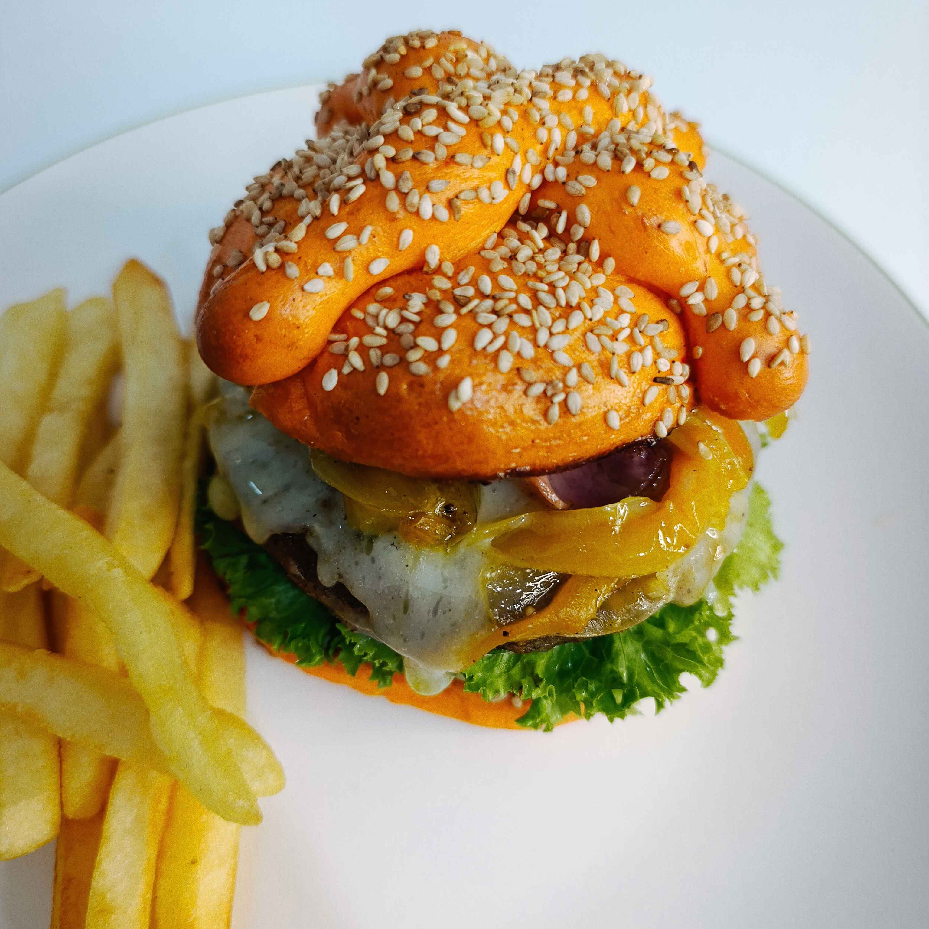 Pan de muerto, carne artesanal de res, cebolla y pimientos caramelizados, lechuga, jitomate, cebolla, queso gouda y tocino.