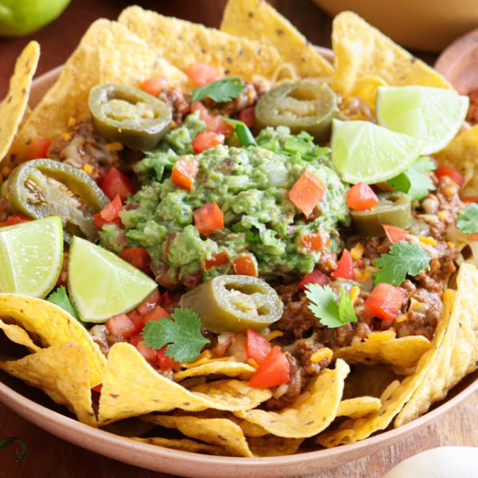 Totopos Cubiertos de Queso Oaxaca, y carne a elegir. con Guacamole en recipiente