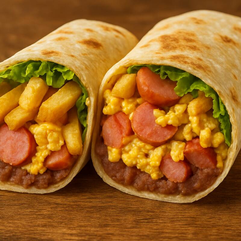 Burrito relleno de Frijol, lechuga, Papas a la francesa, Queso oaxaca, salchicha y huveo.