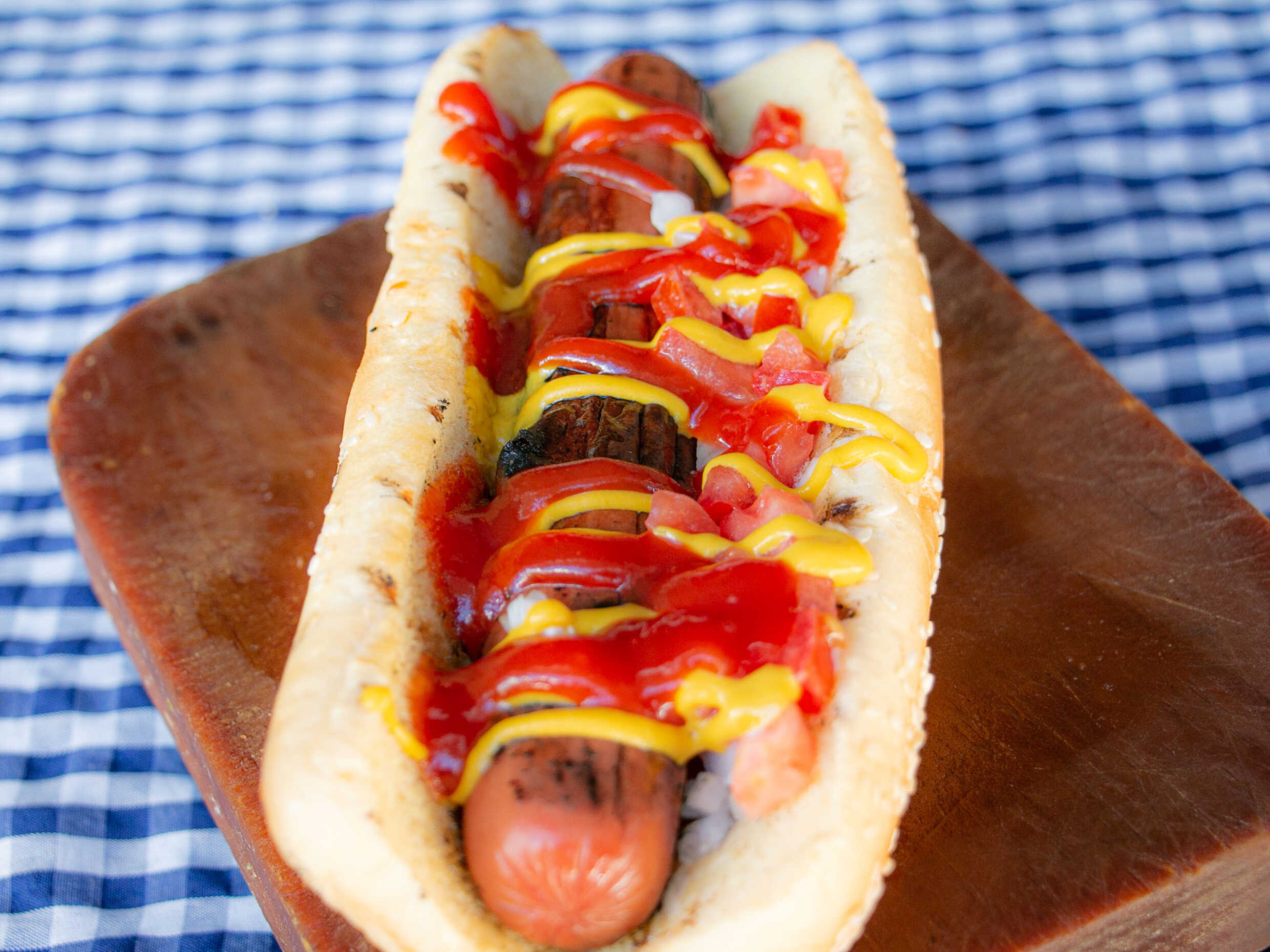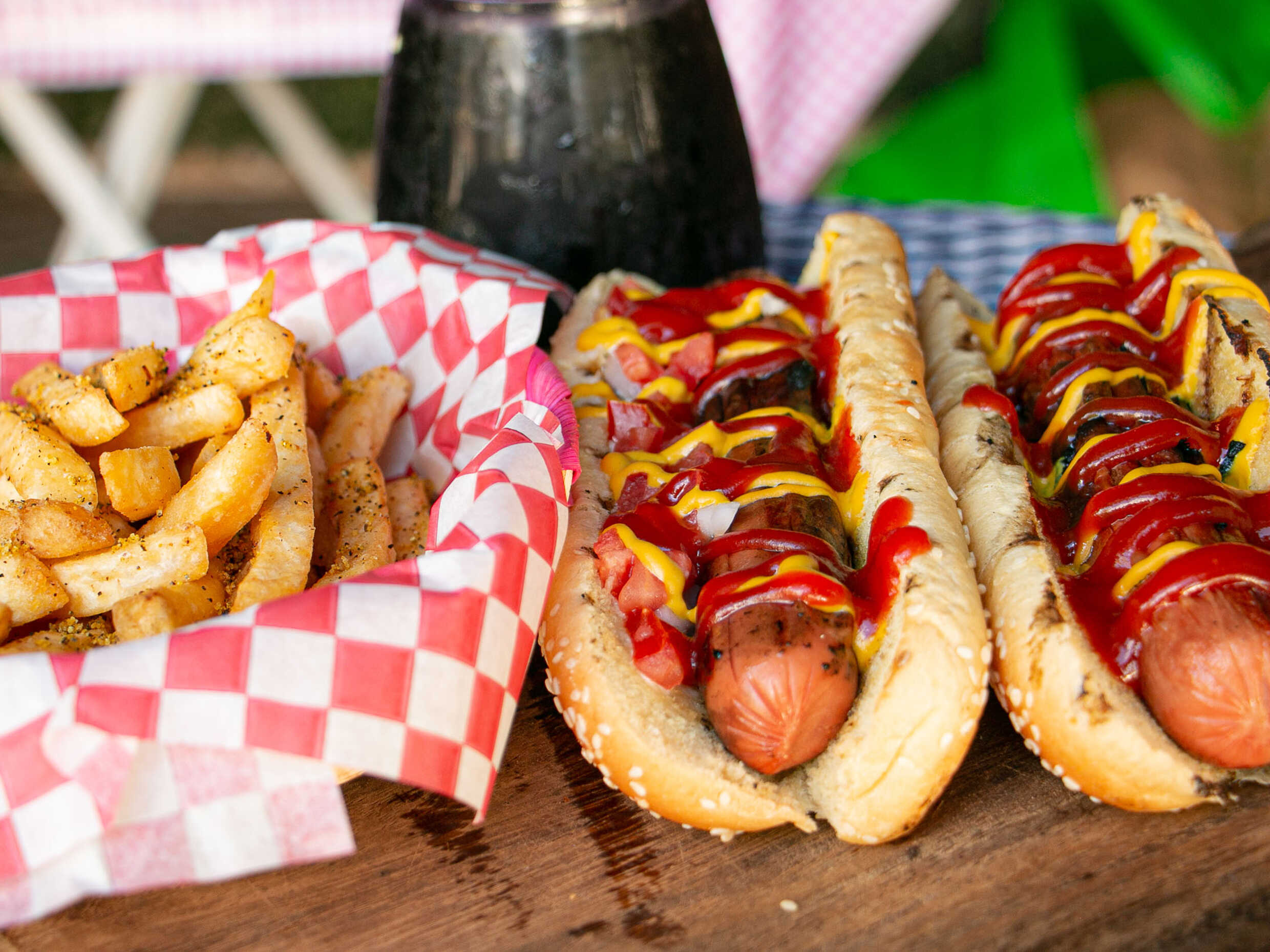 Deliciosos hot dogs jumbo al carbón acompañados de papas y refresco.