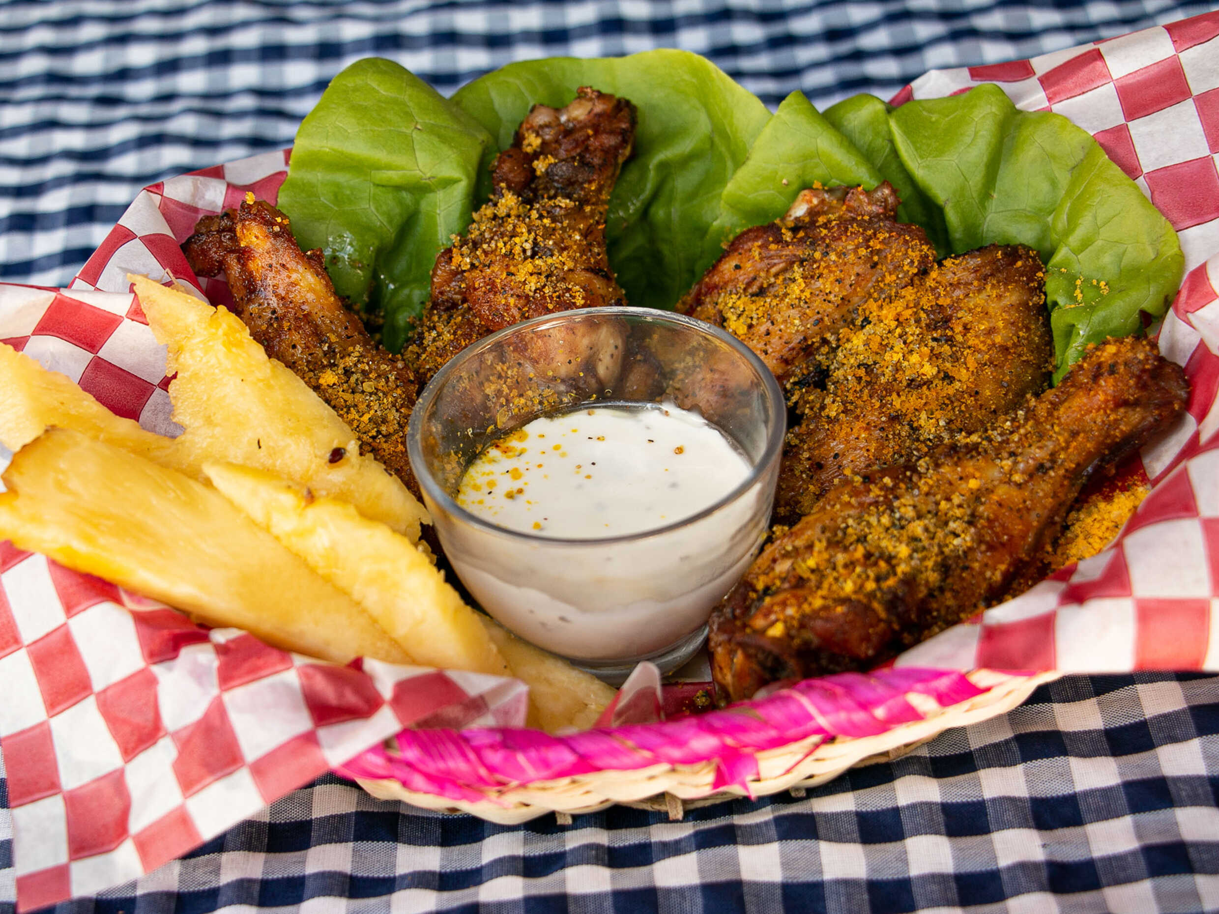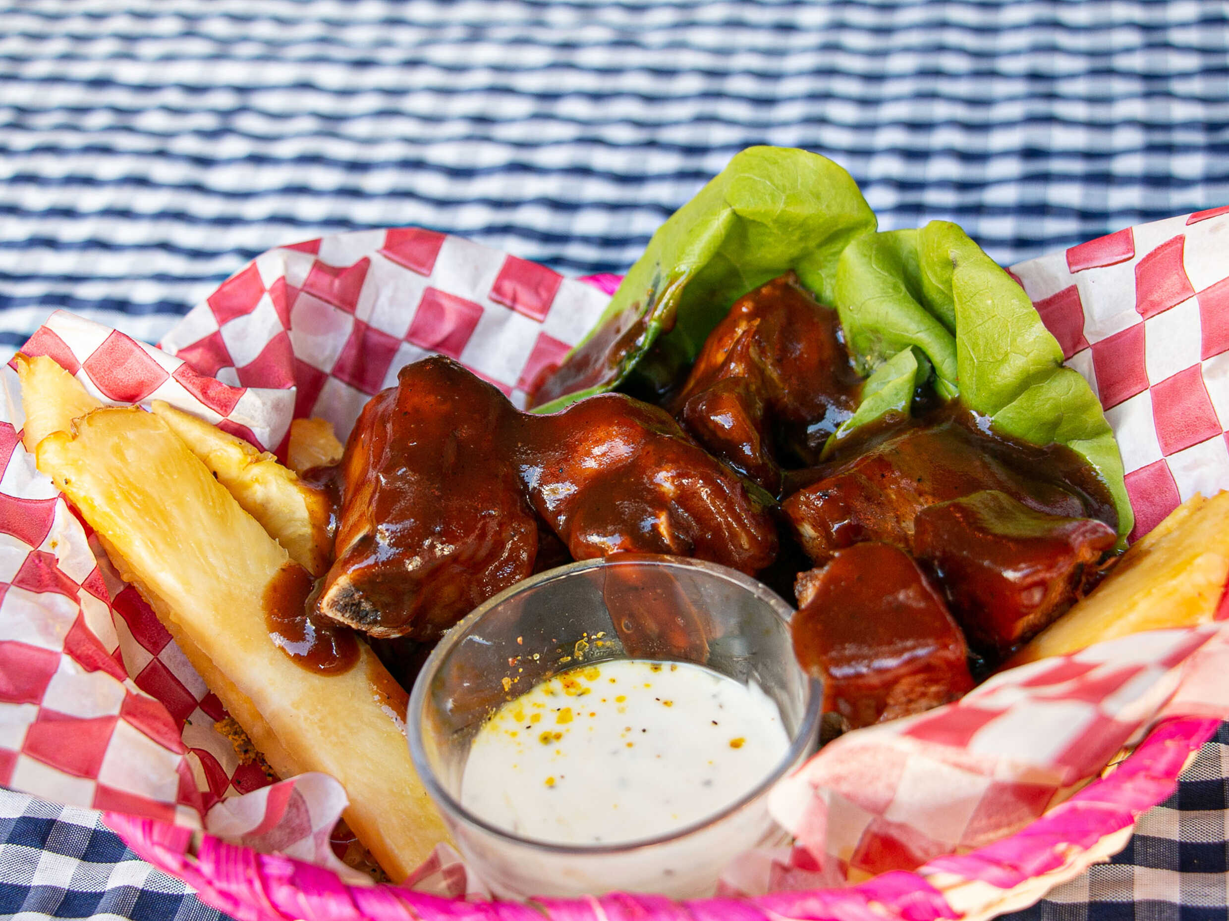 15 Alitas, 15 costillas, 2 ordenes de papas fritas y dos refrescos.