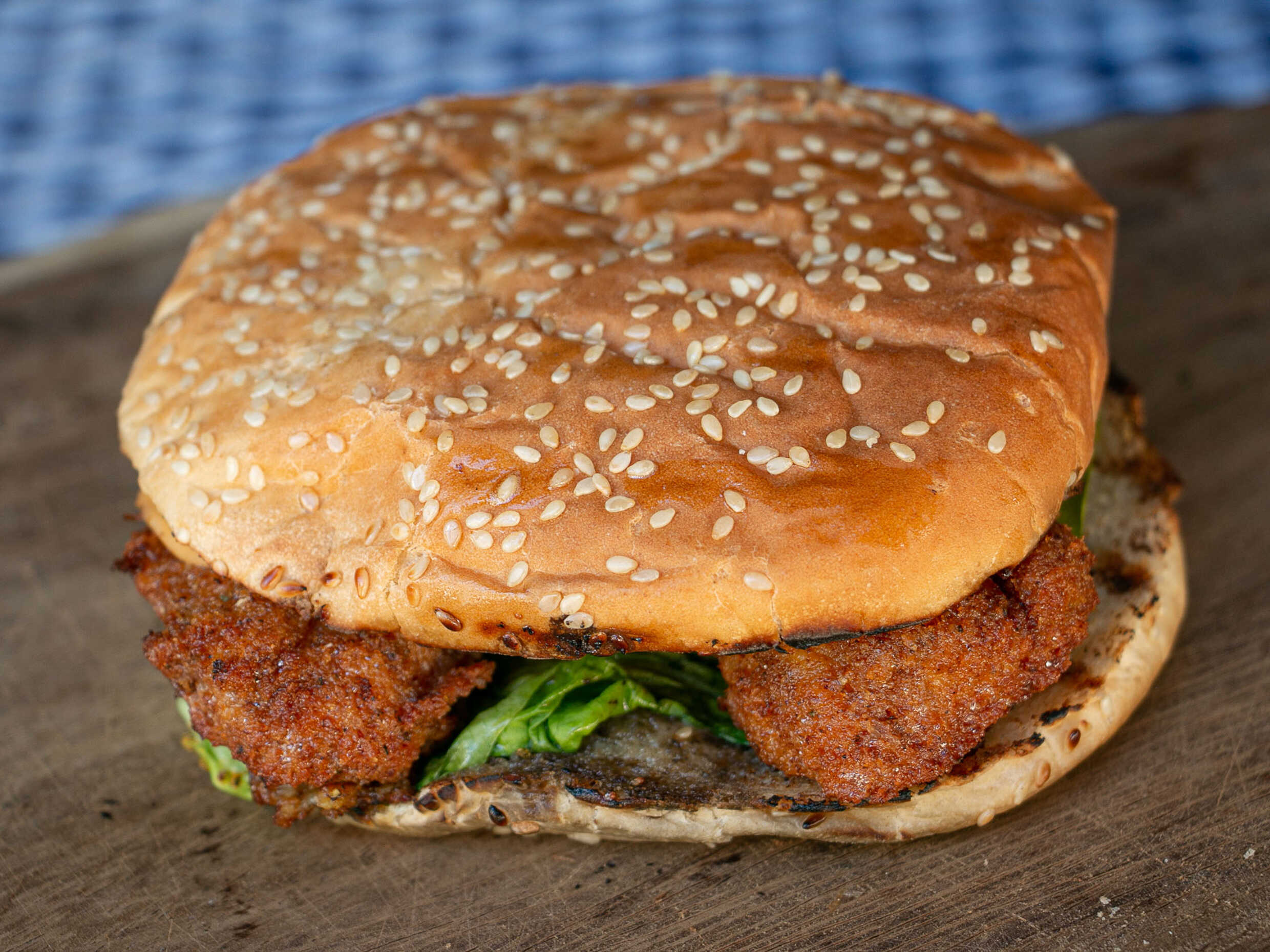 Deliciosa hamburguesa de boneless de pollo al carbón.