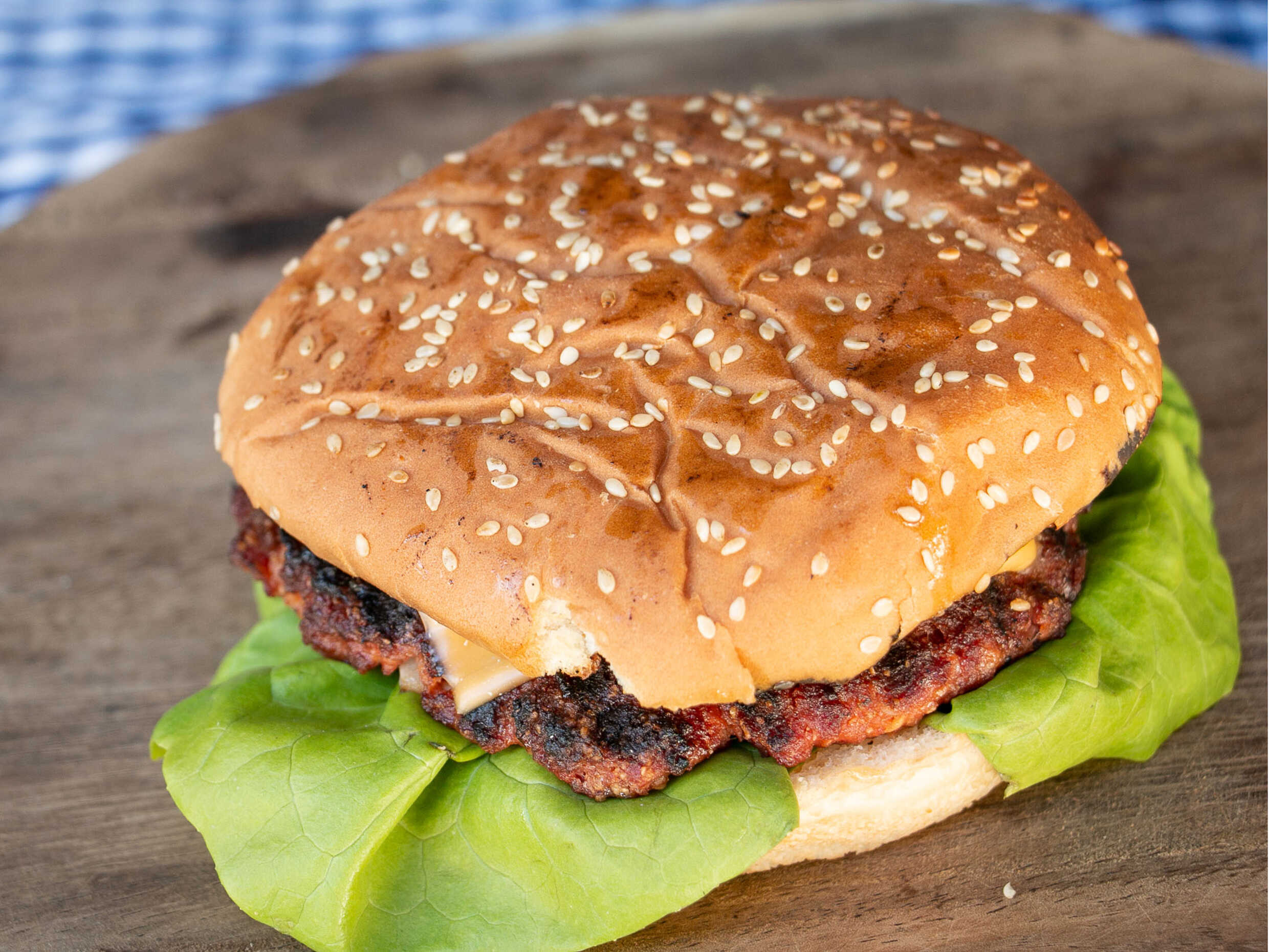 Deliciosa hamburguesa al carbón con dos capas de carne.