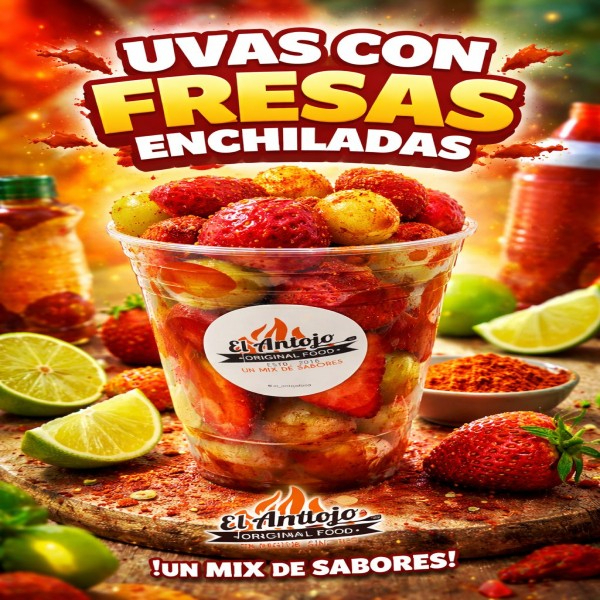 Uvas y fresas enchiladas con chamoy y Miguelito