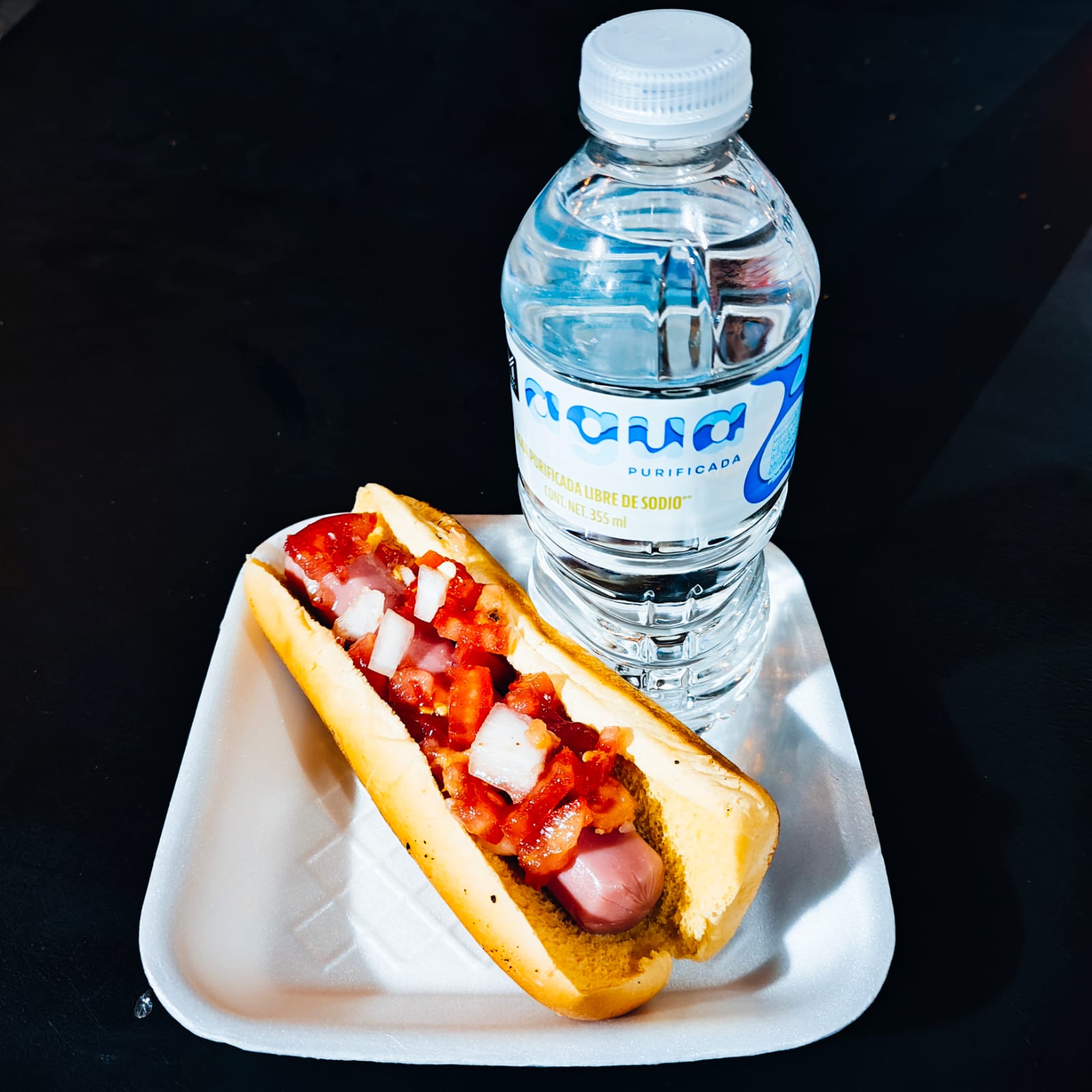 Salchicha, pan sin calentar, aderezos, jitomate, cebolla y agua 355 ml.