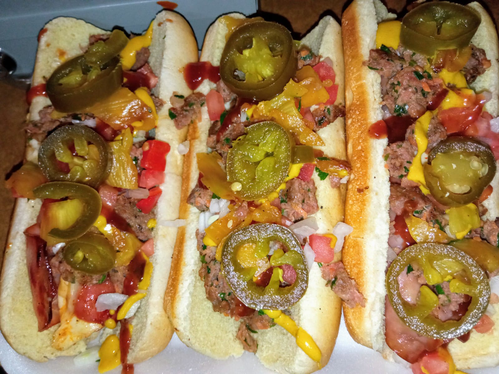 Carne de la casa picada, queso de Oaxaca, tocino, salchicha, piña, cebolla, jitomate, chiles jalapeños, cátsup, mayonesa, mostaza y pan de hot dog regular.